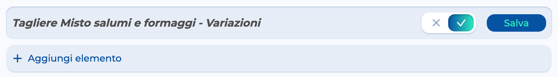 I prodotti inseriti in questa categoria saranno disponibili solo come variazioni, ovvero non compariranno nel menù visibile ai clienti 5. Dopo aver salvato, vedrai tutte le variazioni nella parte bassa dello schermo, in una nuova sezione dedicata.