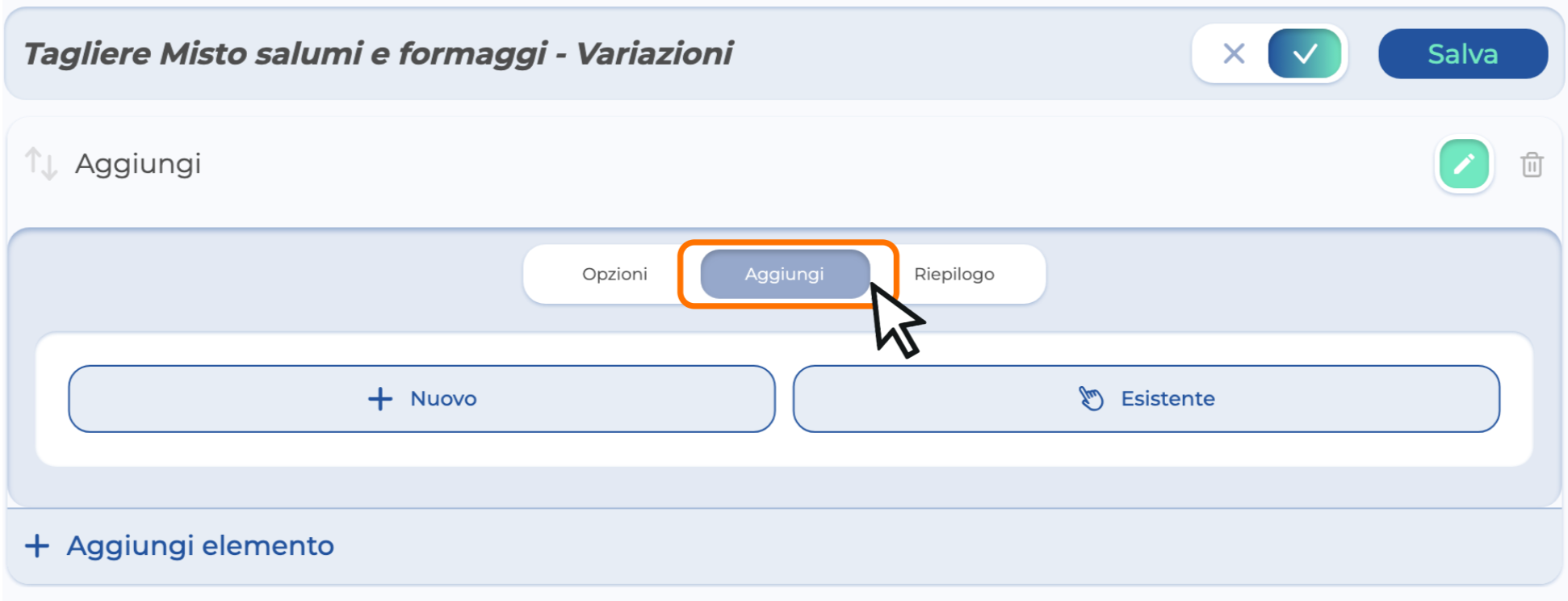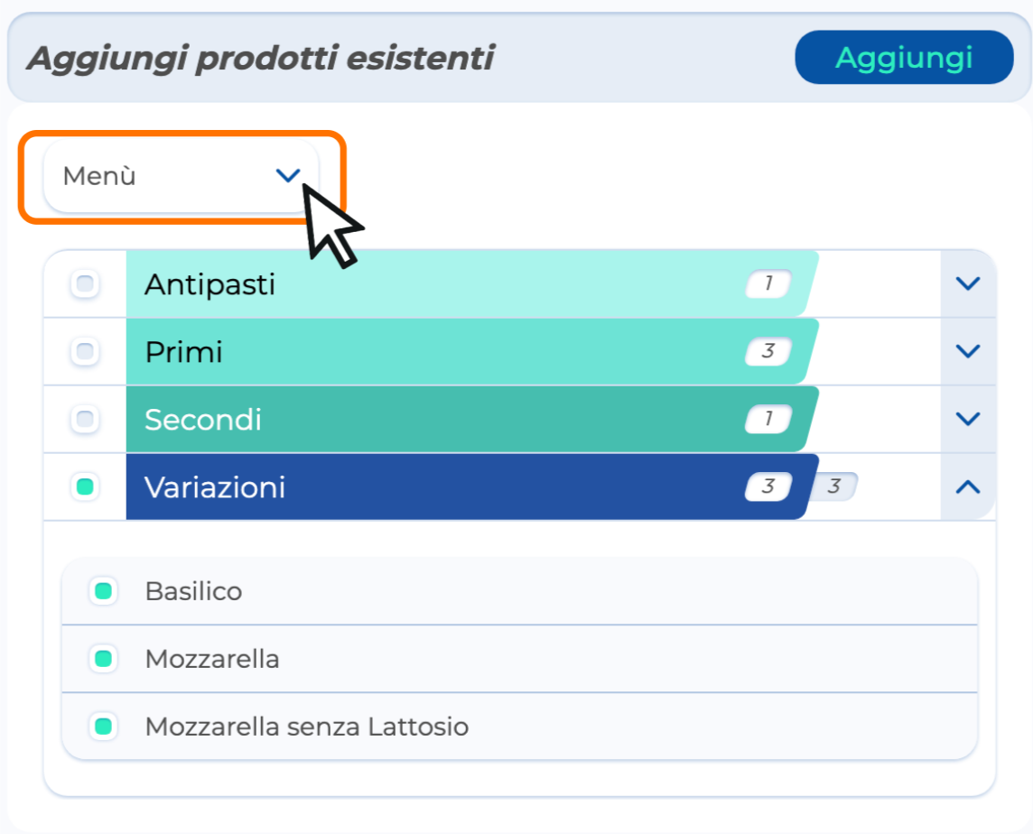 6. Per aggiungere un prodotto già presente nell’anagrafica, clicca su Esistente e seleziona la categoria o il singolo prodotto da inserire.