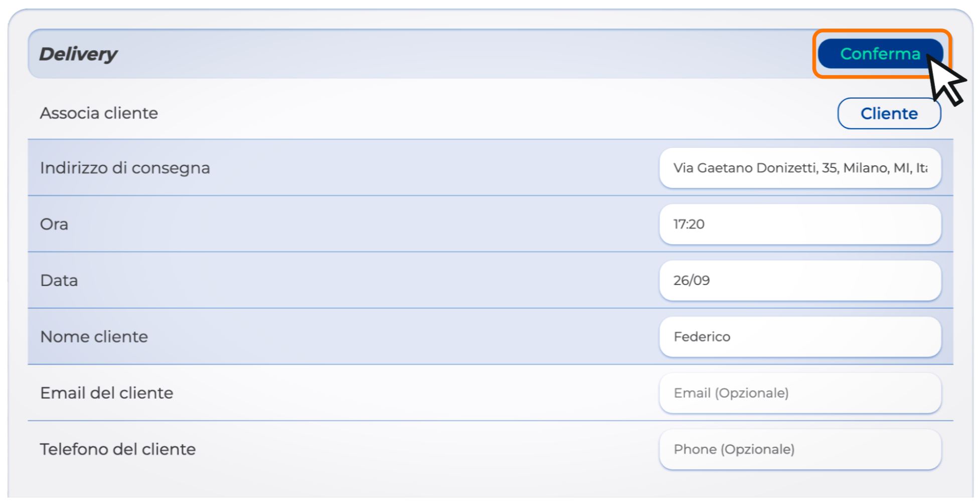 - Email del cliente: facoltativa ma consigliato