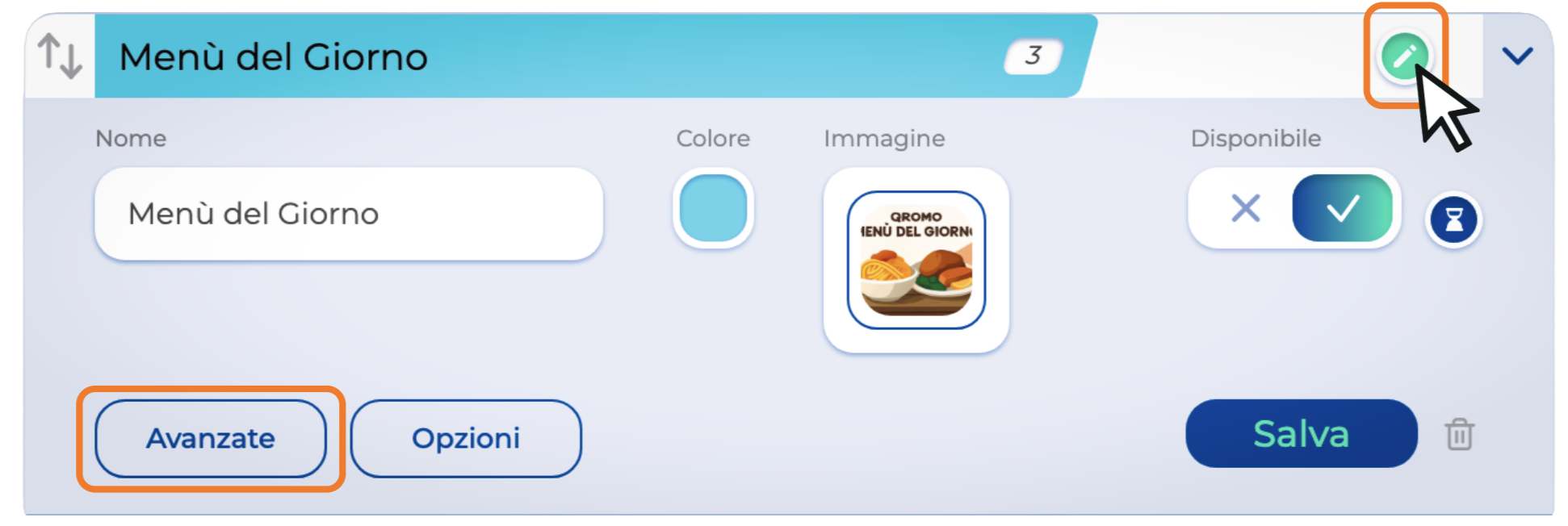 2. Individua la categoria, clicca sull'icona blu della matita e quindi clicca su Avanzate.