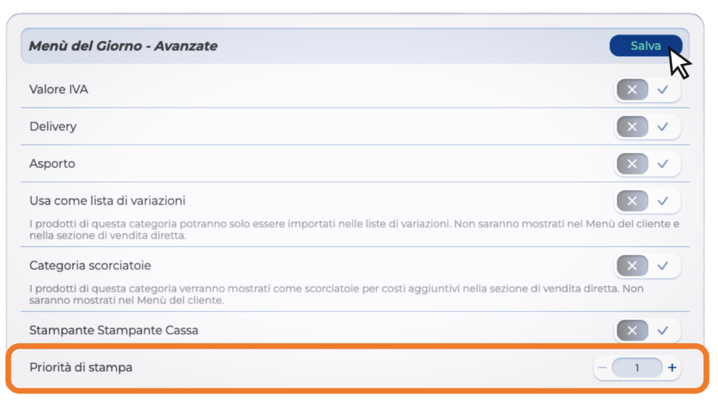 Questa funzione ti permette di scegliere l’ordine in cui le categorie vengono stampate nelle comande, assegnando una priorità.