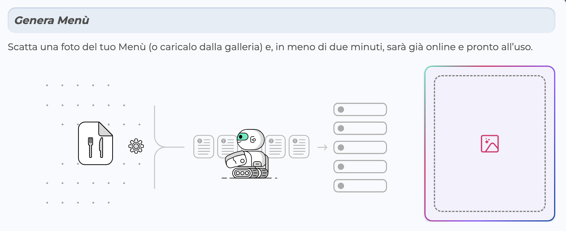 - Automatico con AI: Carica un PDF e l'AI leggerà il file e importerà automaticamente i piatti e prezzi