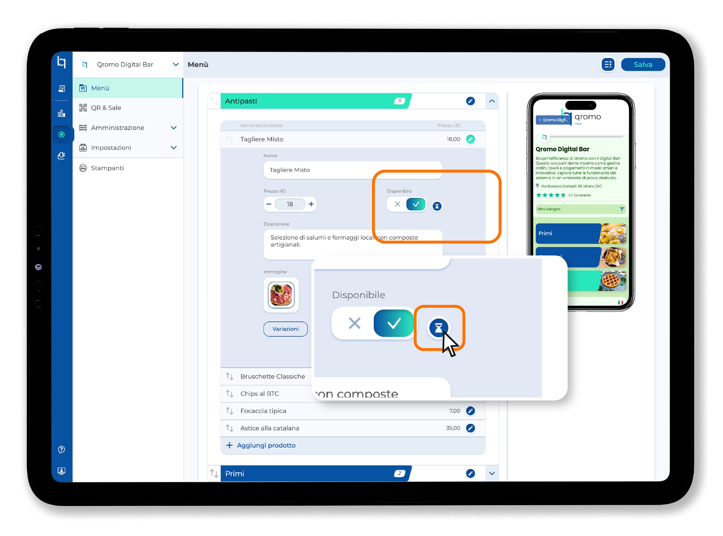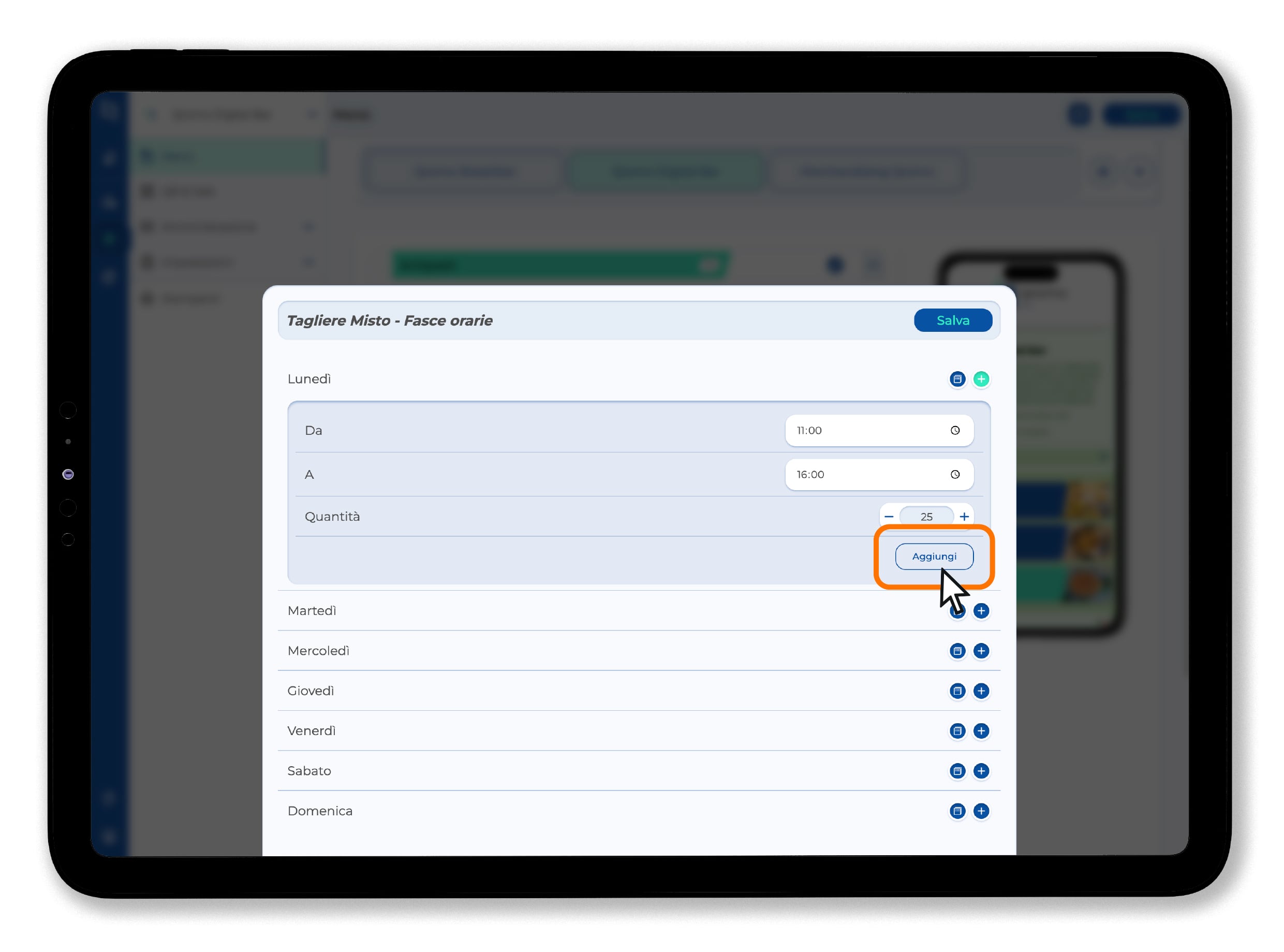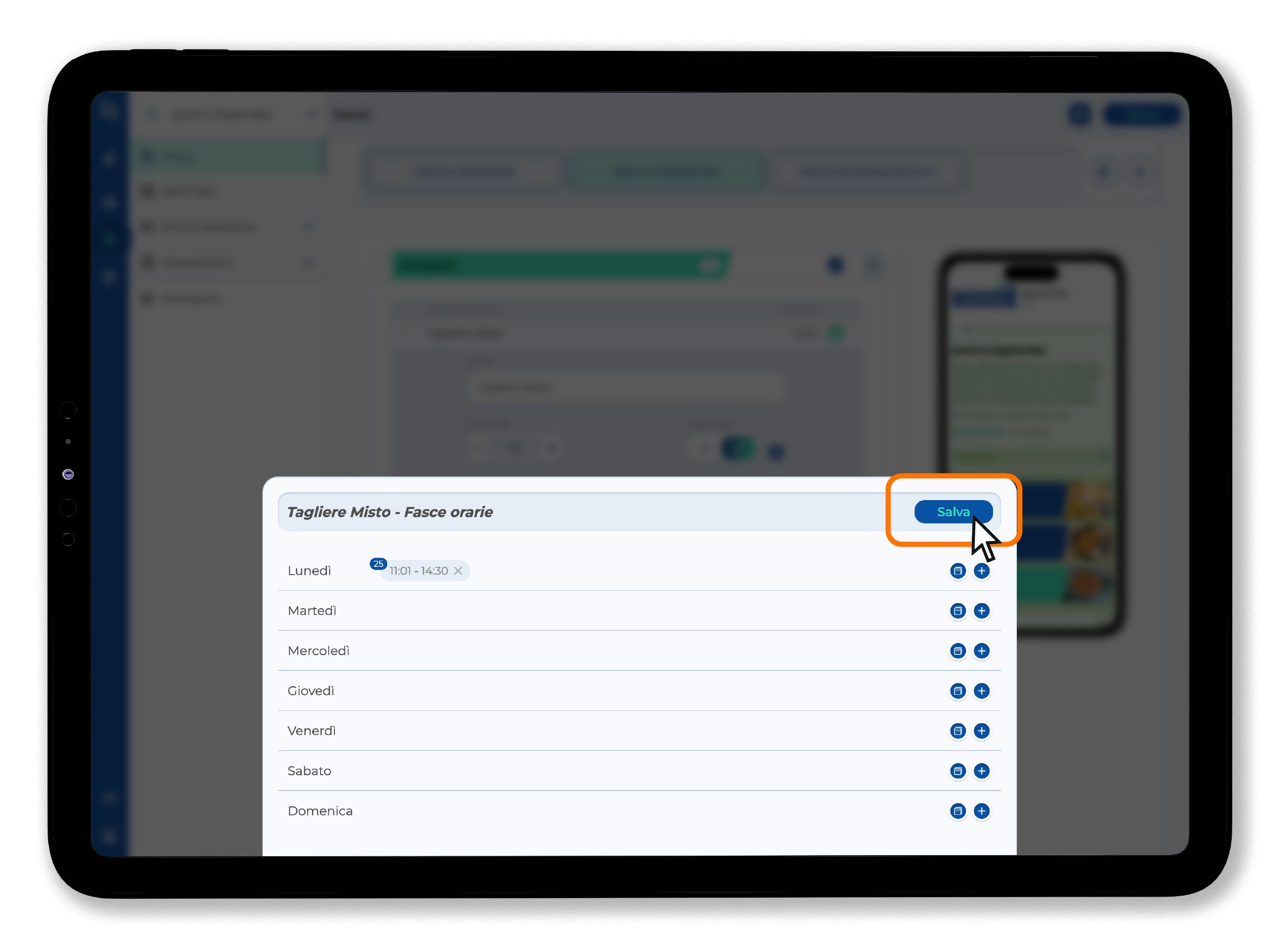 Questa funzione è particolarmente utile per eventi o serate cicliche, perché ti permette di evitare modifiche manuali al menù. Ad esempio, puoi rendere visibile un prodotto solo in un certo giorno ad una determinata fascia oraria