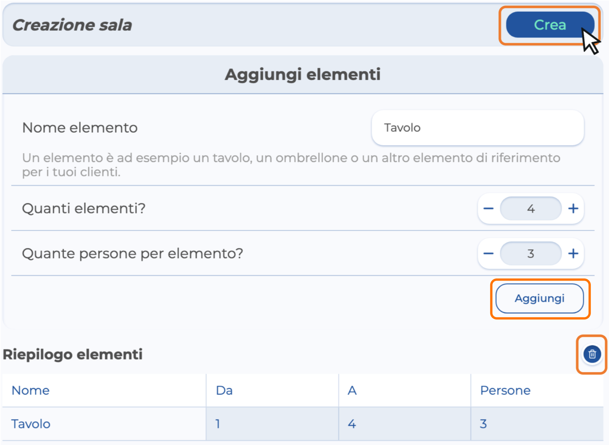 Non serve aggiungere i numeri, verranno assegnati in automatico in modo progressivo - Quanti elementi?: Inserisci il numero totale di elementi presenti nella Sala
