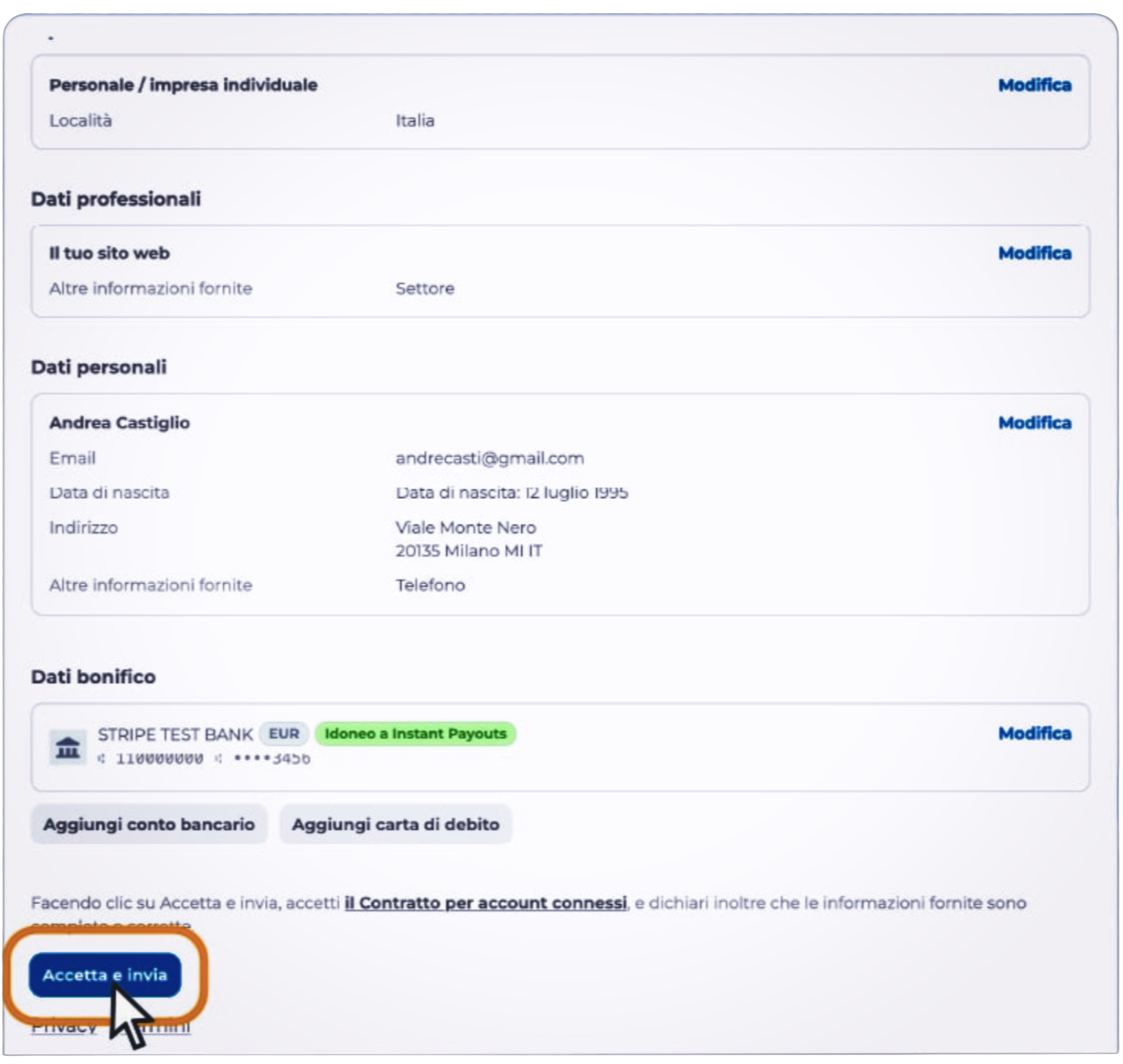 7. Una volta controllato che tutte le informazioni siano corrette nella sezione "Rivedi e Invia" puoi proseguire cliccando su Accetta e Invia