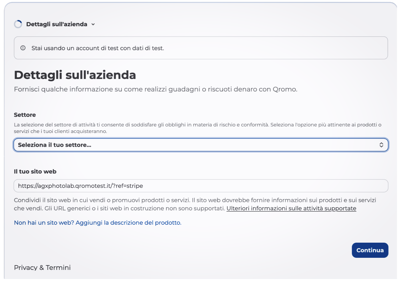 Stripe ti chiederà di inserire e selezionare informazioni dettagliate riguardanti la tua attività e i dati personali del titolare.