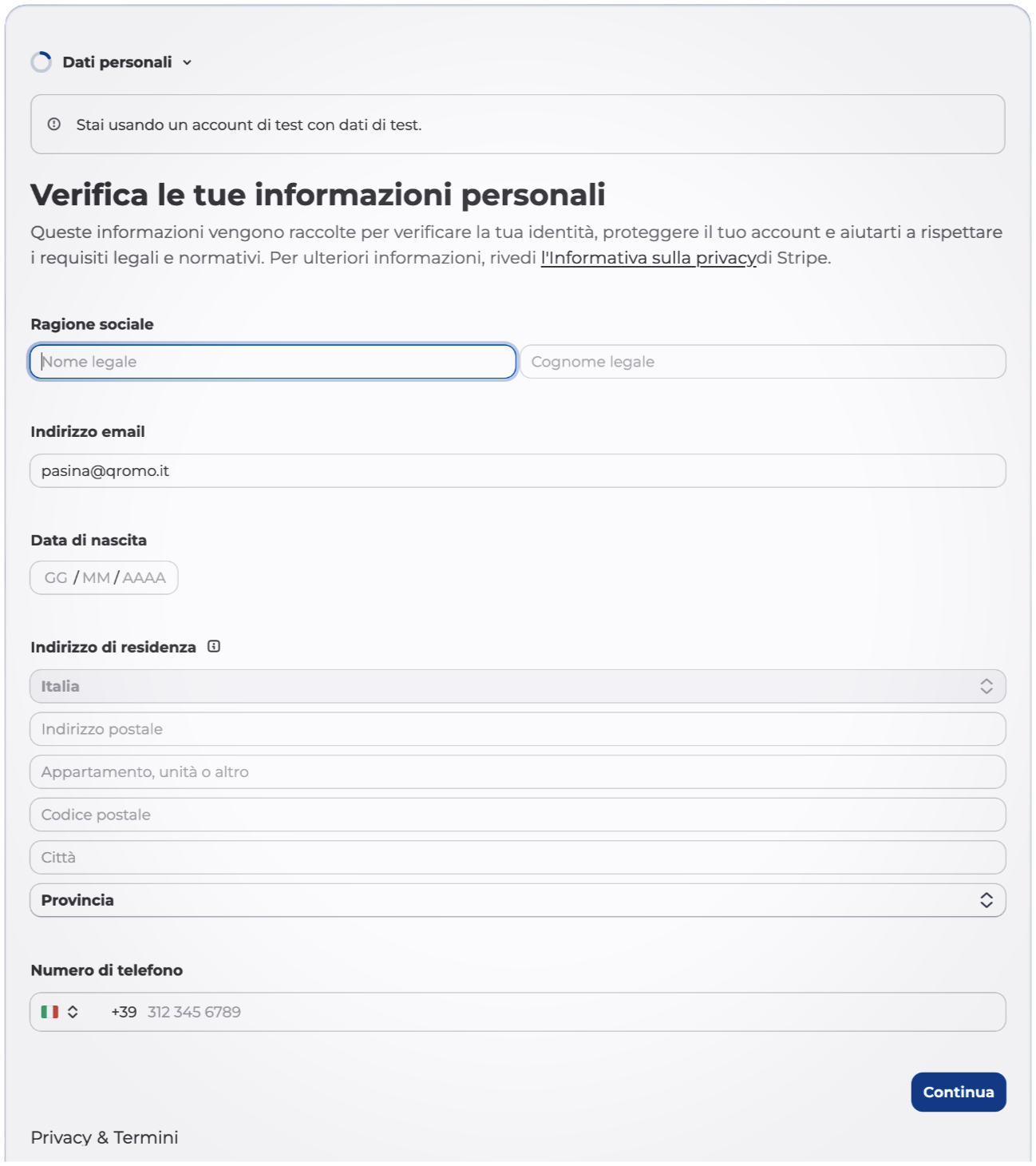 Segui i passaggi seguenti per configurare il tuo account Stripe direttamente dalla tua dashboard Qromo e iniziare subito ad incassare