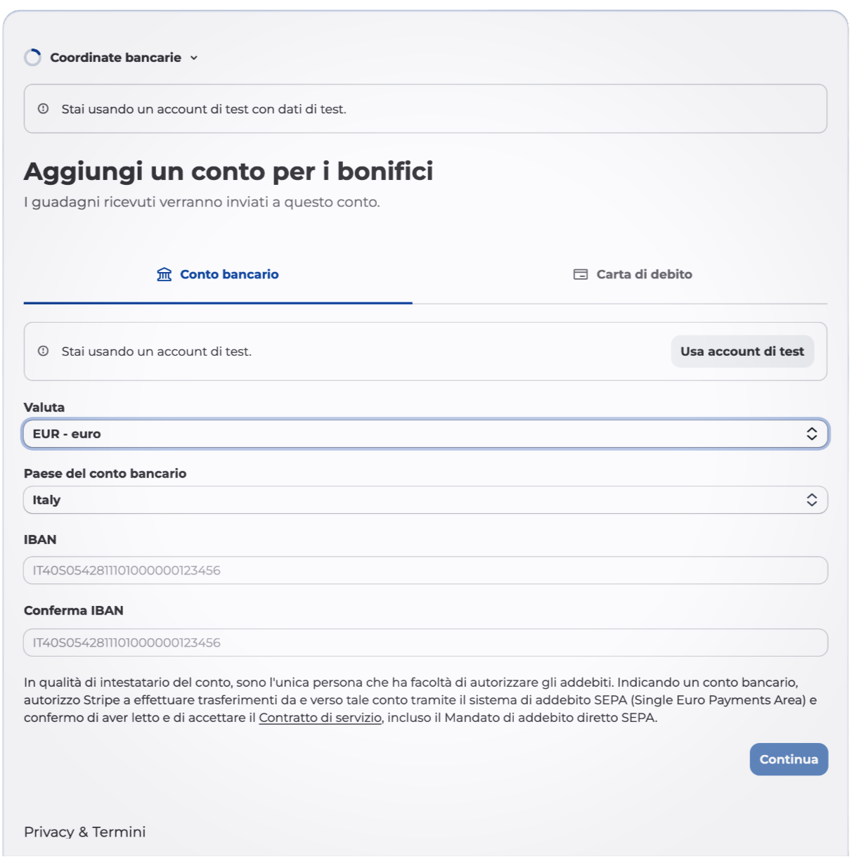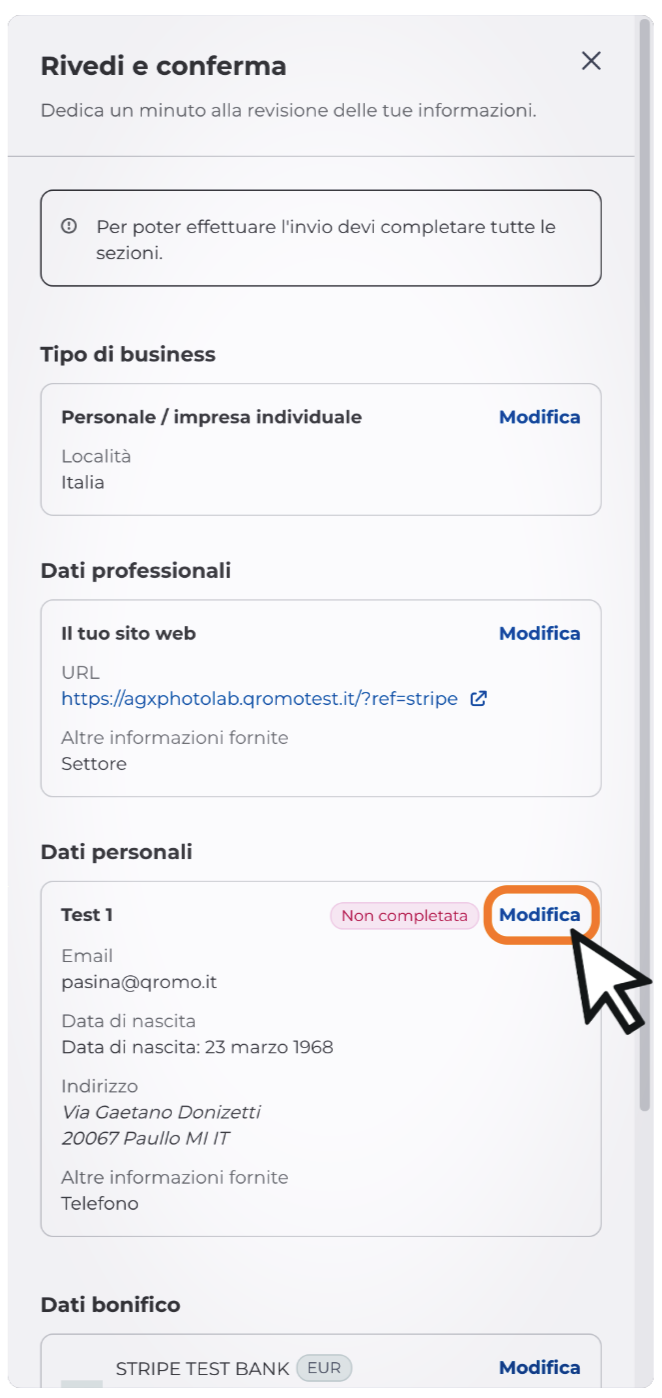 6. Se le informazioni che hai inserito in Stripe non risultano corrette, il sistema te lo segnala e dovrai cliccare sul pulsante "Modifica" per correggere.