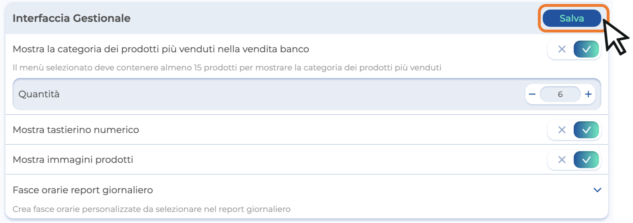 - Fasce orarie del Report Giornaliero: inserisci i tuoi orari di lavoro. Se li dividi per servizi e clicchi su ciascuna fascia oraria, puoi visualizzare subito il report corrispondente a quella fascia oraria specifica.