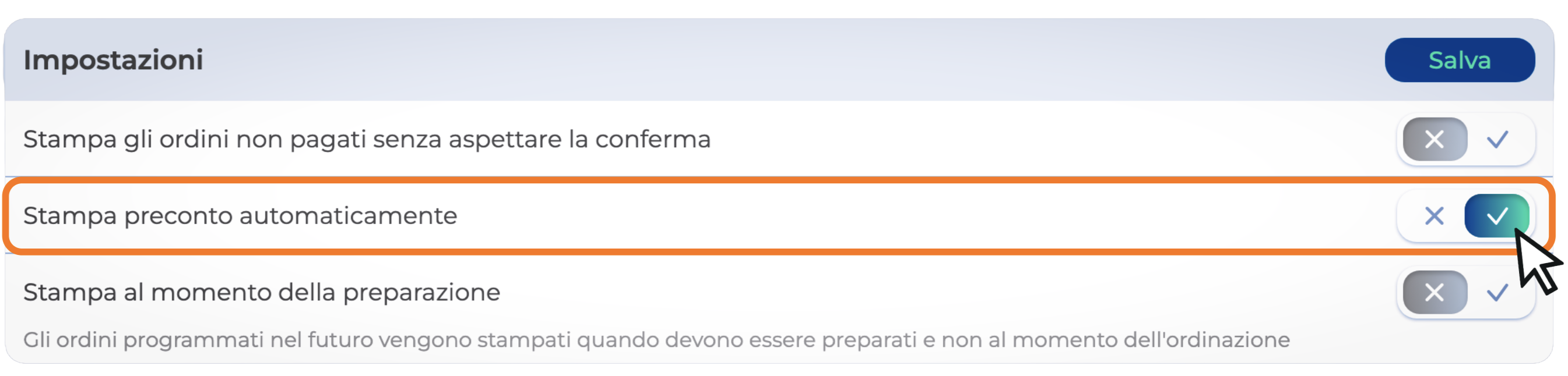 Abilita il pulsante della voce Stampa preconto automaticamente, e successivamente premi su Salva per confermare la modifica.