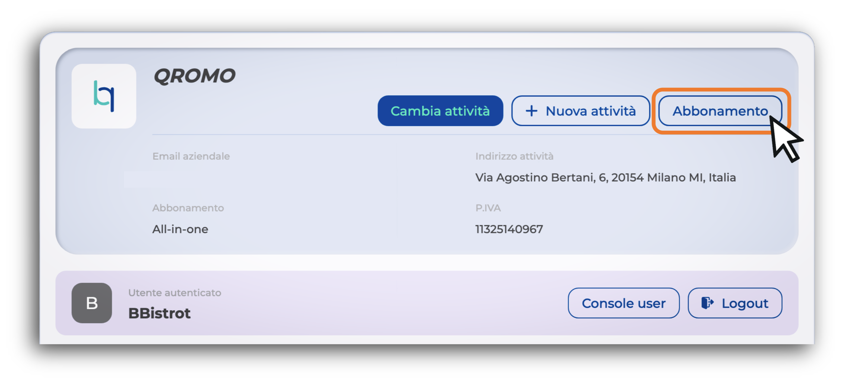 2. Accedi a Qromo. Seleziona l’icona dell'omino in basso a sinistra nella banda blu, fai click su Abbonamento.