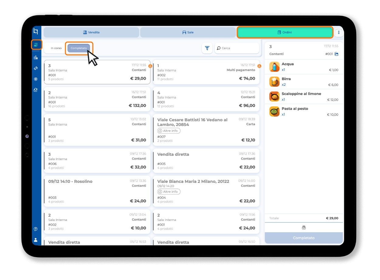 Per ristampate uno scontrino elettronico con la Qromo Printer, è necessario aver già attivato il servizio di scontrino elettronico, CLICCA QUI per la guida completa all'attivazione1. Accedi dall'app alla sezione Ordini, poi seleziona Completati