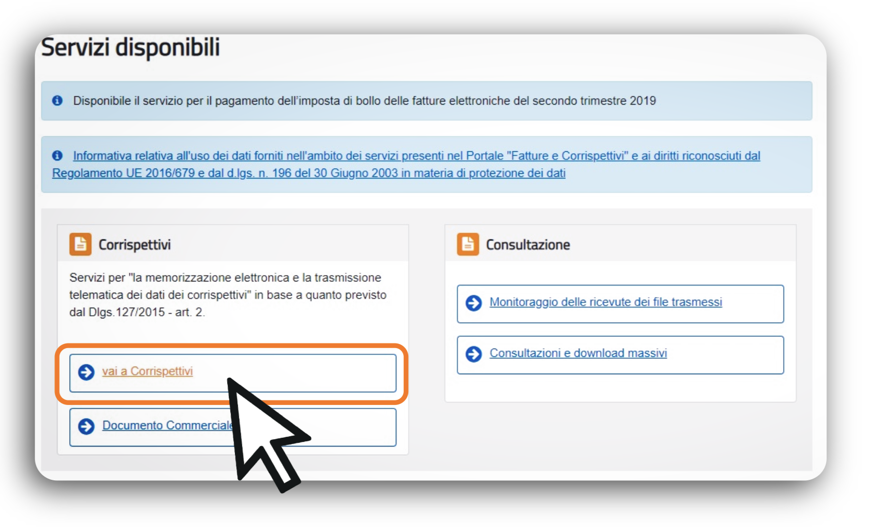 Nella pagina principale, clicca su "Fatturazione Elettronica" e poi su "Vai a Corrispettivi".