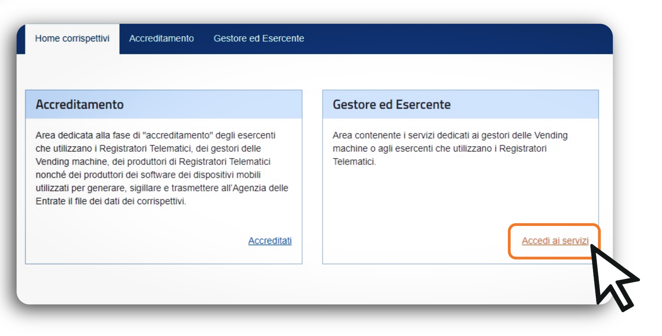 All'interno della home "Corrispettivi", seleziona "Accedi ai servizi" sotto la sezione "Gestore ed Esercente".