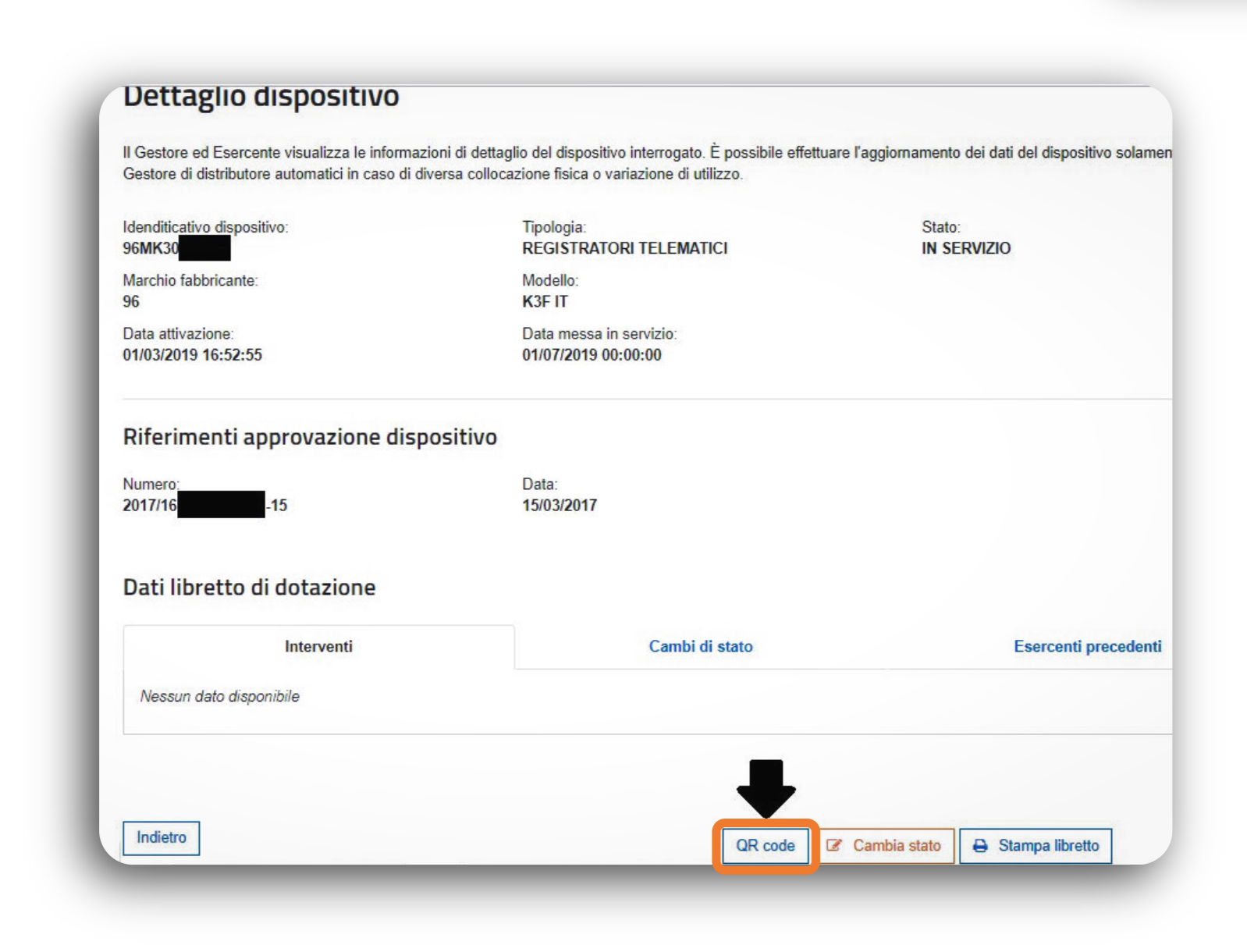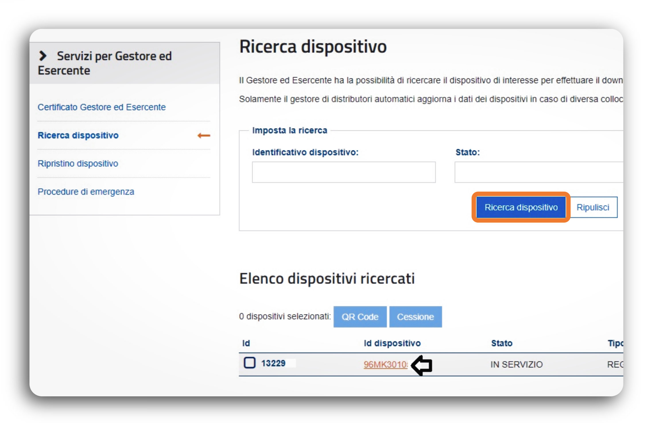Nel menu a sinistra, clicca su "Ricerca Dispositivo" e avvia la ricerca senza inserire filtri. Verranno mostrati tutti i dispositivi associati alla tua partita IVA.