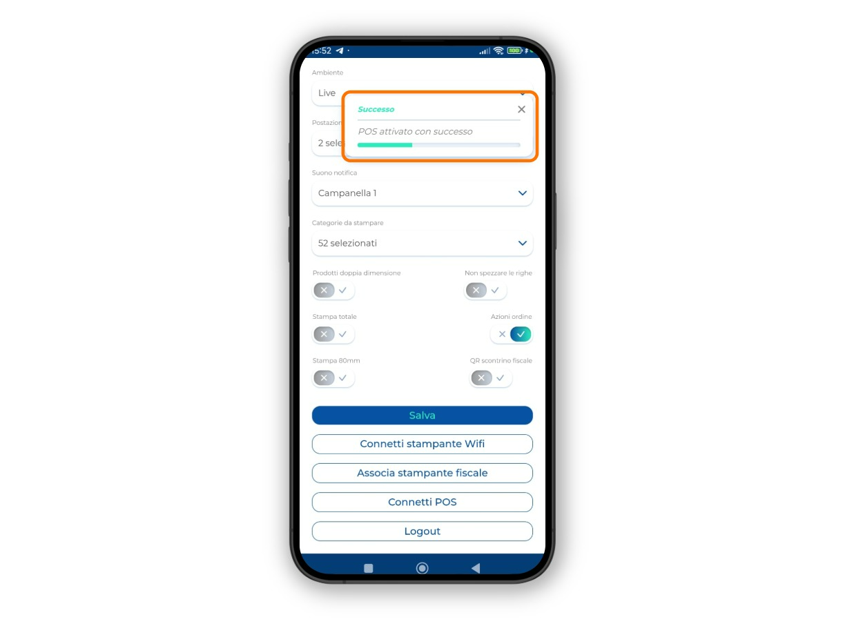 7. Attendi qualche secondo fino alla conferma: "POS attivato con successo".