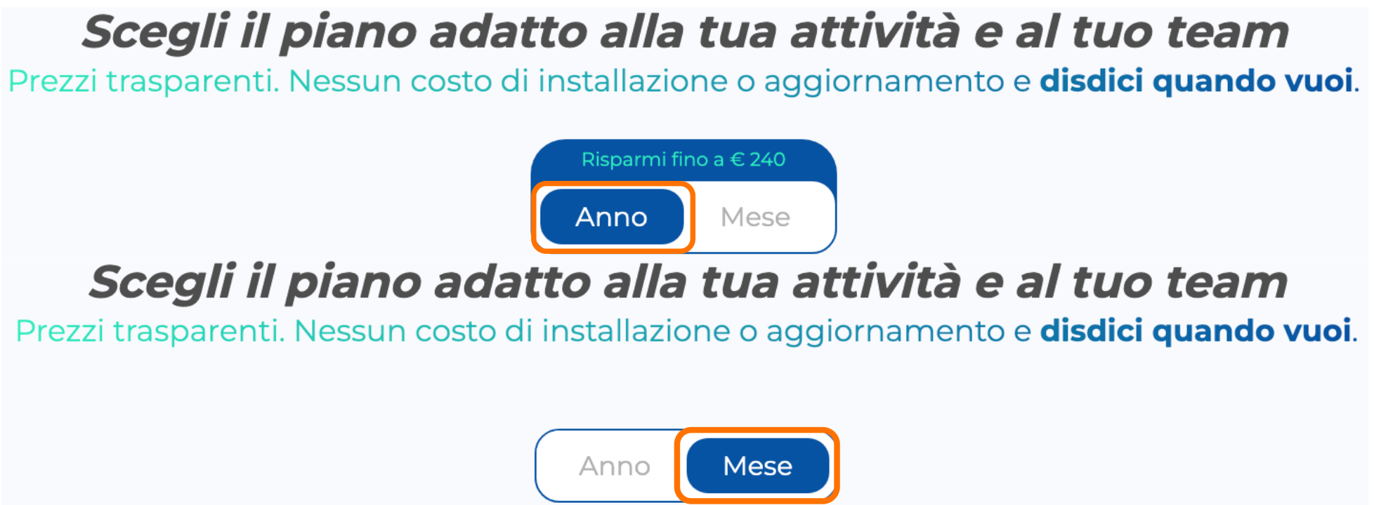 seleziona se vuoi il rinnovo mensile o annuale (l'annuale ha uno sconto del 30%)