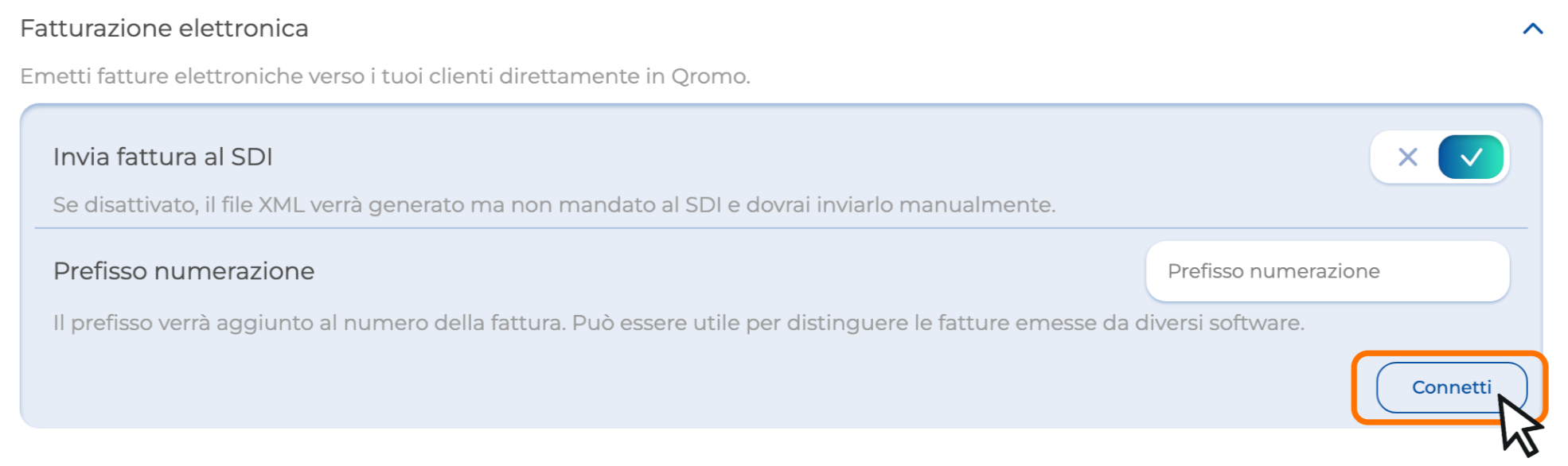 - Prefisso Numerazione: Inserisci un prefisso alla numerazione (es. QRO) per distinguere le fatture emesse direttamente da QROMO