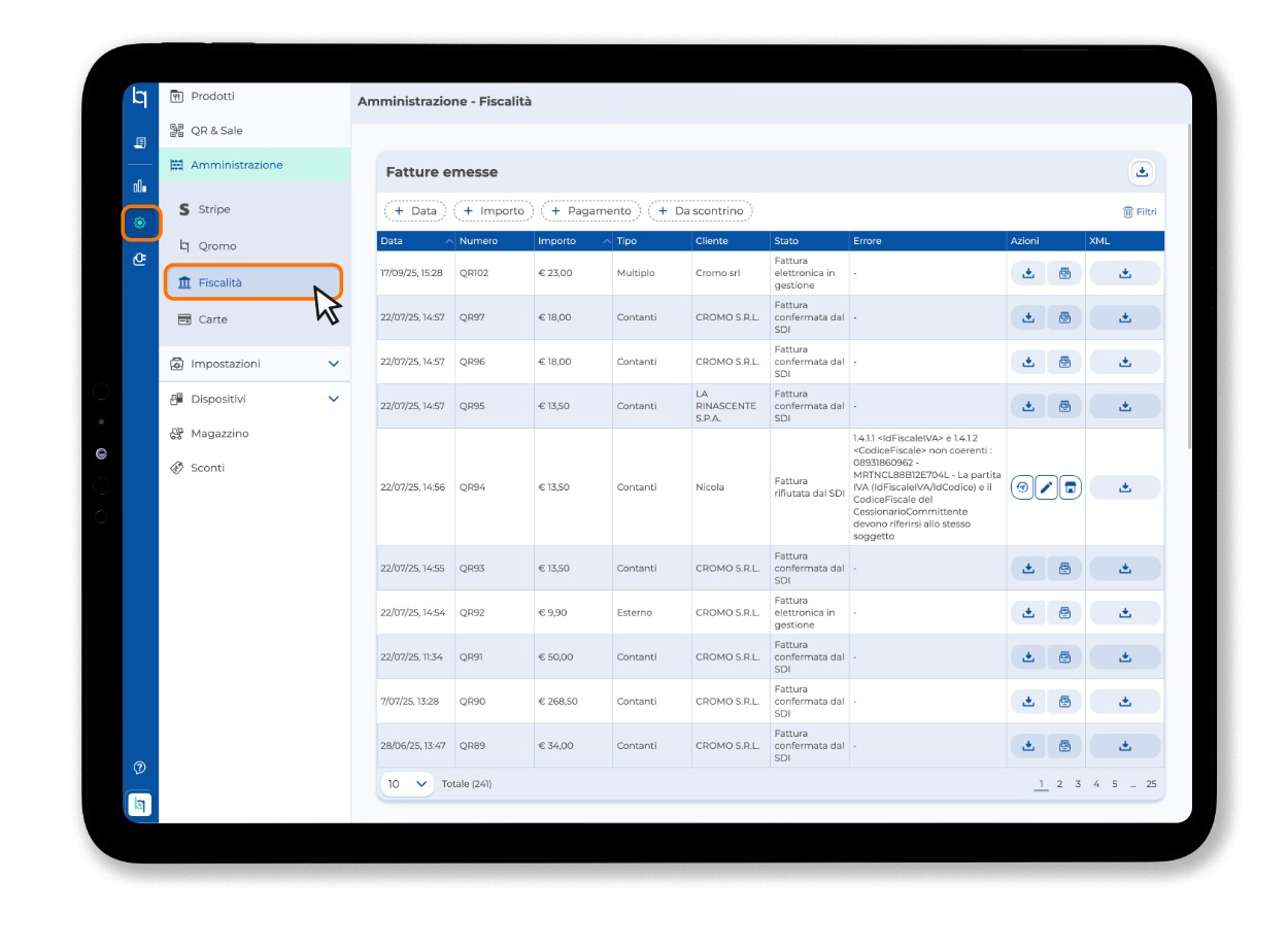 Con Qromo puoi emettere fatture direttamente dal gestionale dalla maschera di pagamento, in più avrai la sezione riepilogo fatture dedicat.