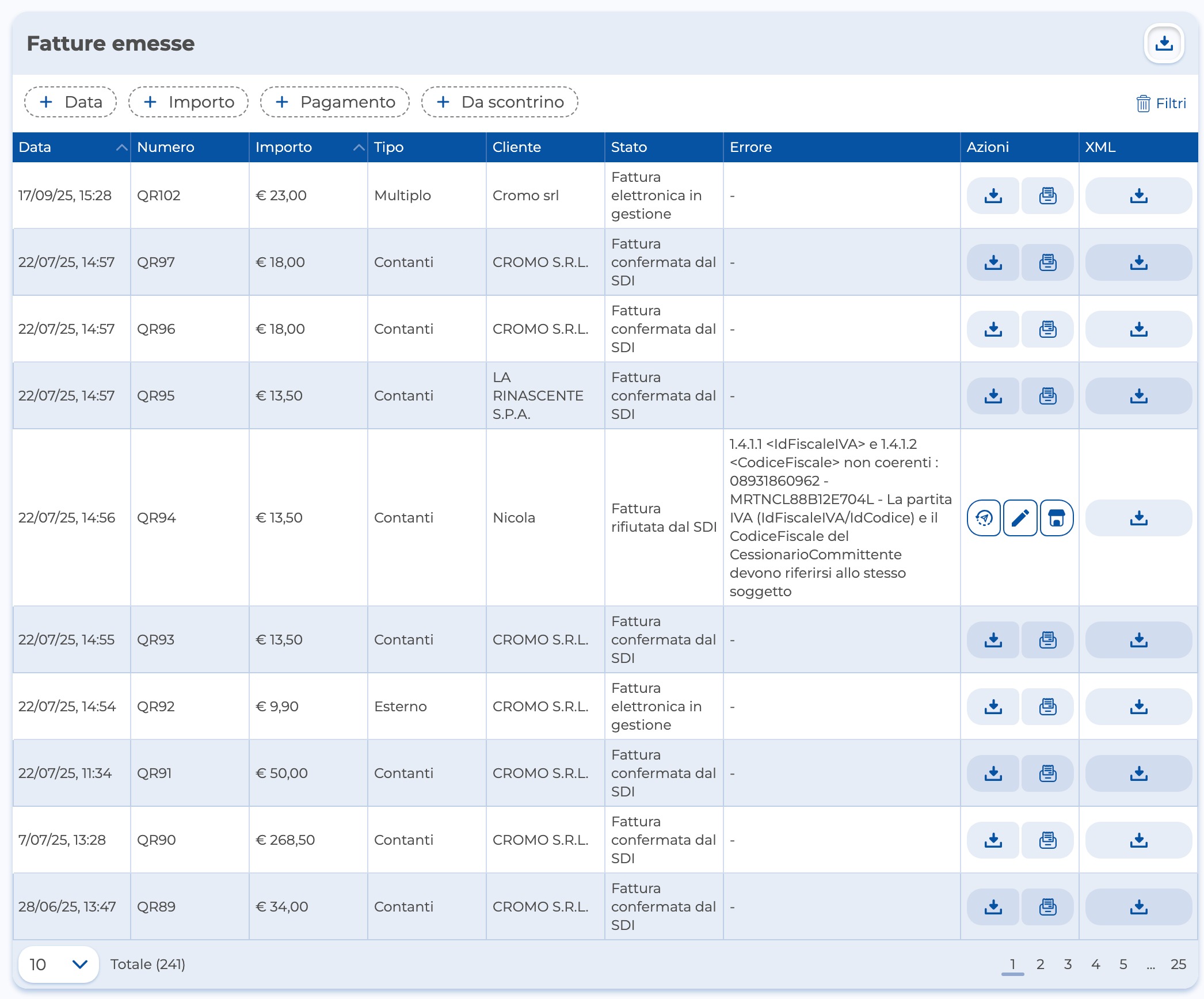 - Azioni: in base allo stato della fattura qui troverai dei pulsanti che ti aiuteranno nella gestione delle fatture