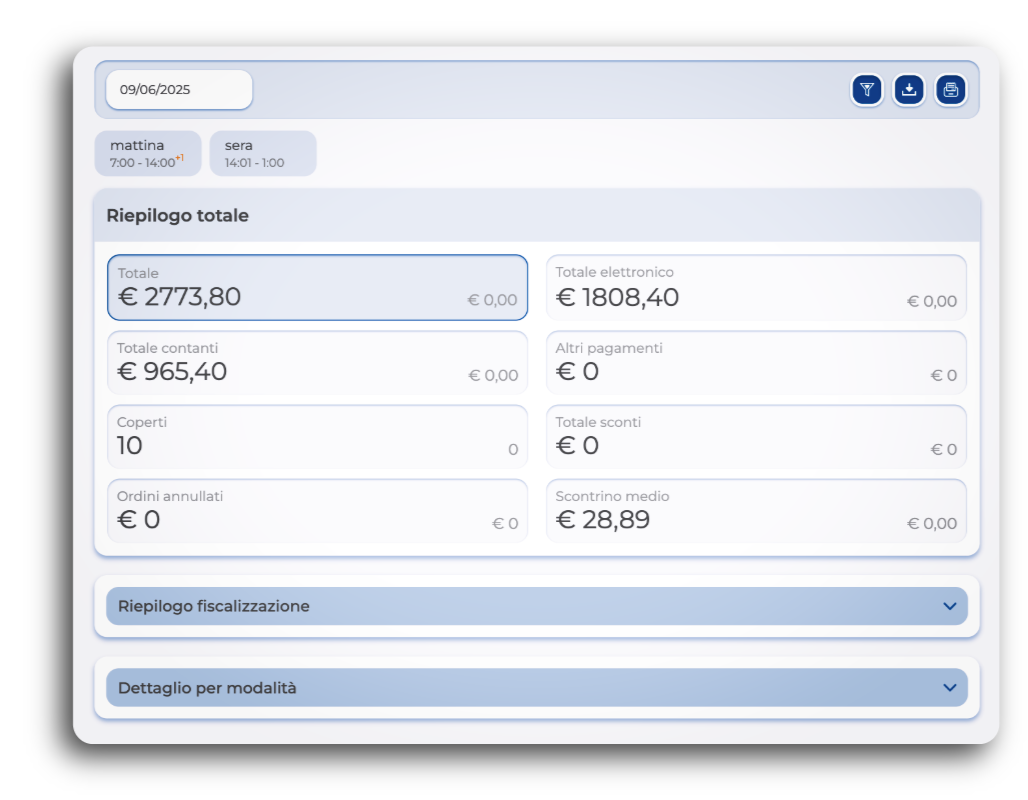 Il riepilogo mostra gli incassi e i dati principali della giornata selezionata, non si tratta di un documento fiscale ma fornisce una panoramica chiara sull’andamento giornaliero.