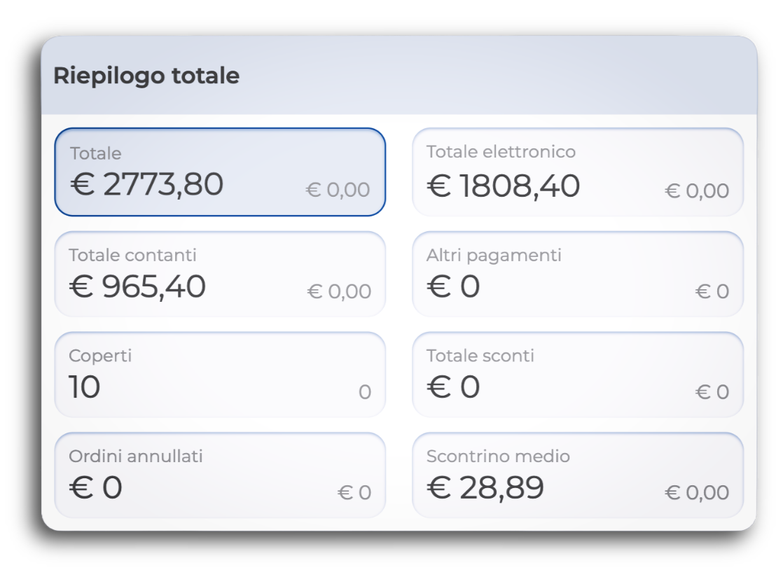 - Totale elettronico: Mostra gli incassi ricevuti tramite carte di credito o debito, ed anche Satispay