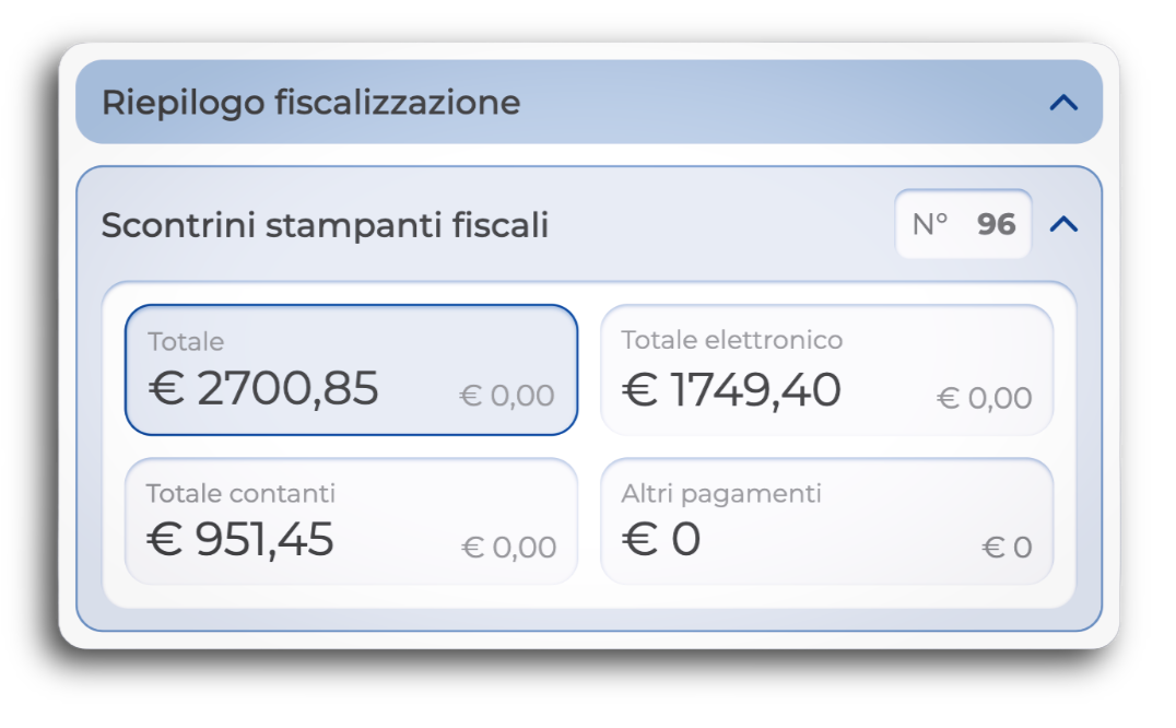 Anche qui ritrovi le stesse voci presenti nel riepilogo principale (totale, contanti, elettronico, altri pagamenti), ma suddivise per modalità come: