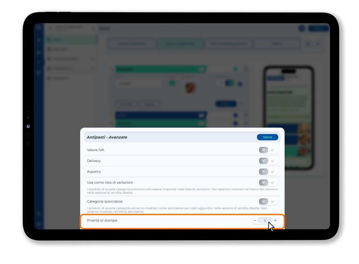 Questa funzionalità ti permette di organizzare l’ordine dei prodotti sulle stampe di comanda, assegnando una priorità alle categorie. In questo modo puoi decidere, ad esempio, che gli antipasti vengano stampati prima dei primi, o che alcune categorie siano considerate più importanti di altre.