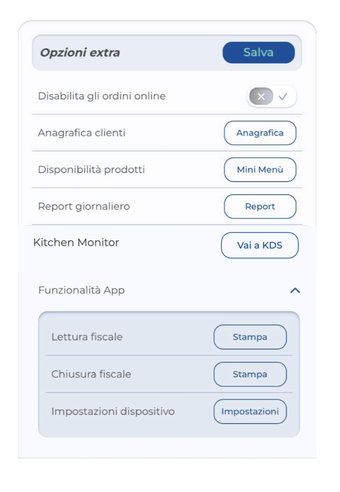 - Funzionalità app: raccoglie alcune funzioni visibili solo da app, utili principalmente per la gestione fiscale e di alcuni dispositivi associati