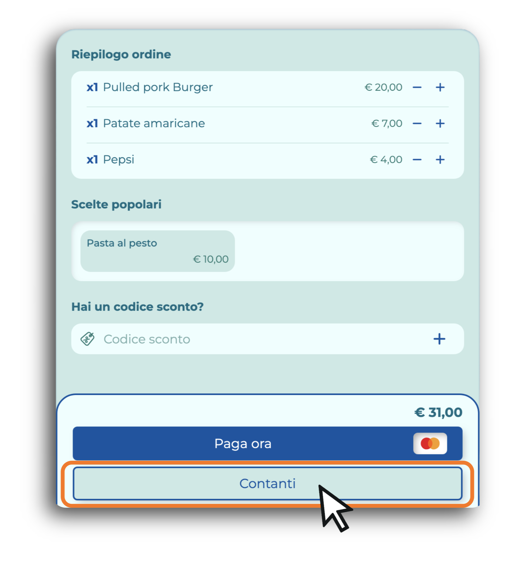 - Aggiungere il nuovo ordine al totale del tavolo e poi procedere al pagamento dell’intero importo in un secondo momento, cliccando su Contanti.