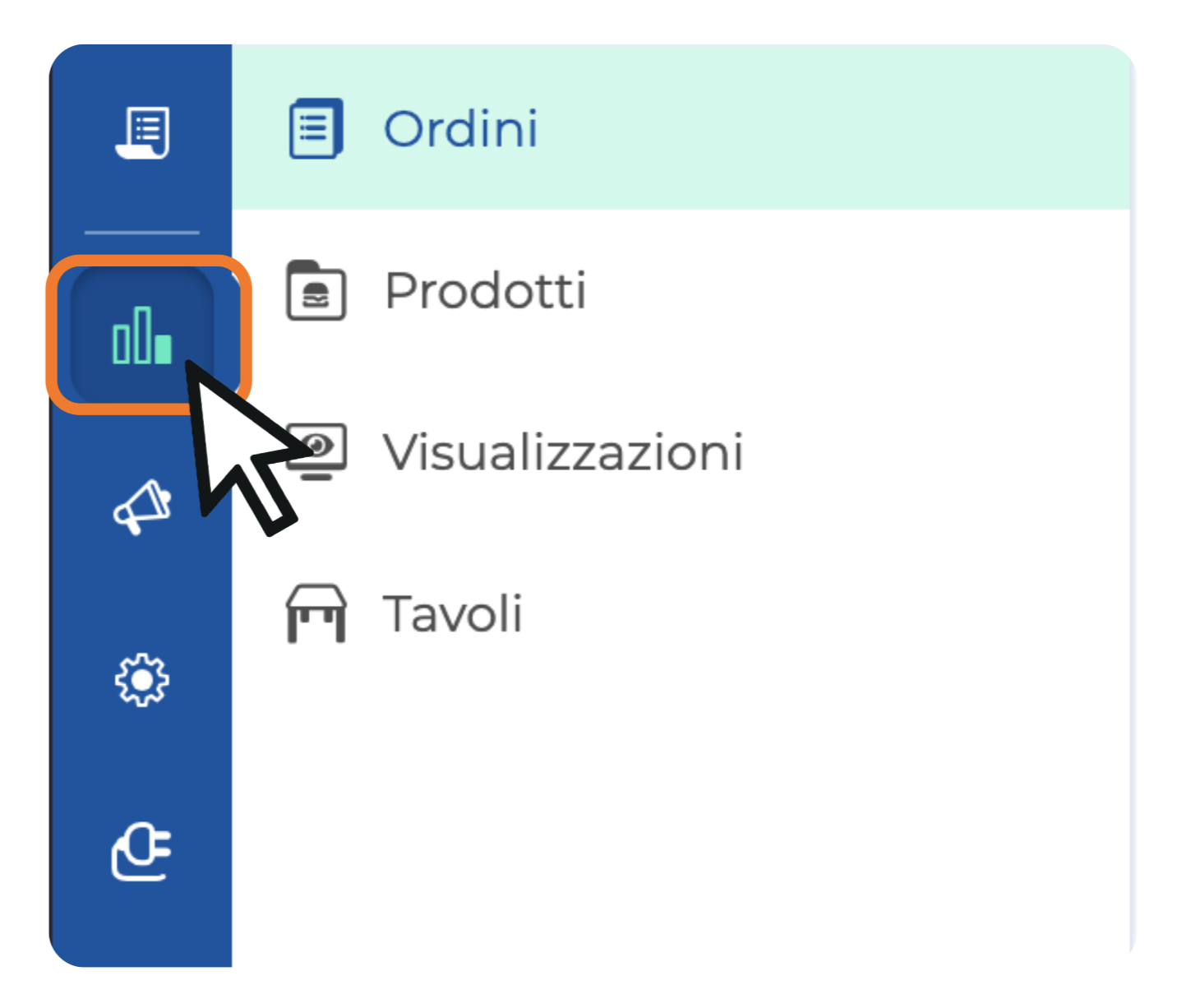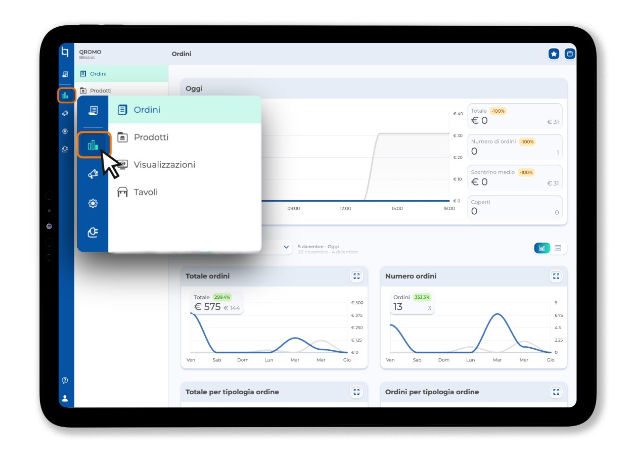 2. Si aprirà automaticamente la sezione "Ordini", ma da qui puoi accedere anche ad altre sezioni: