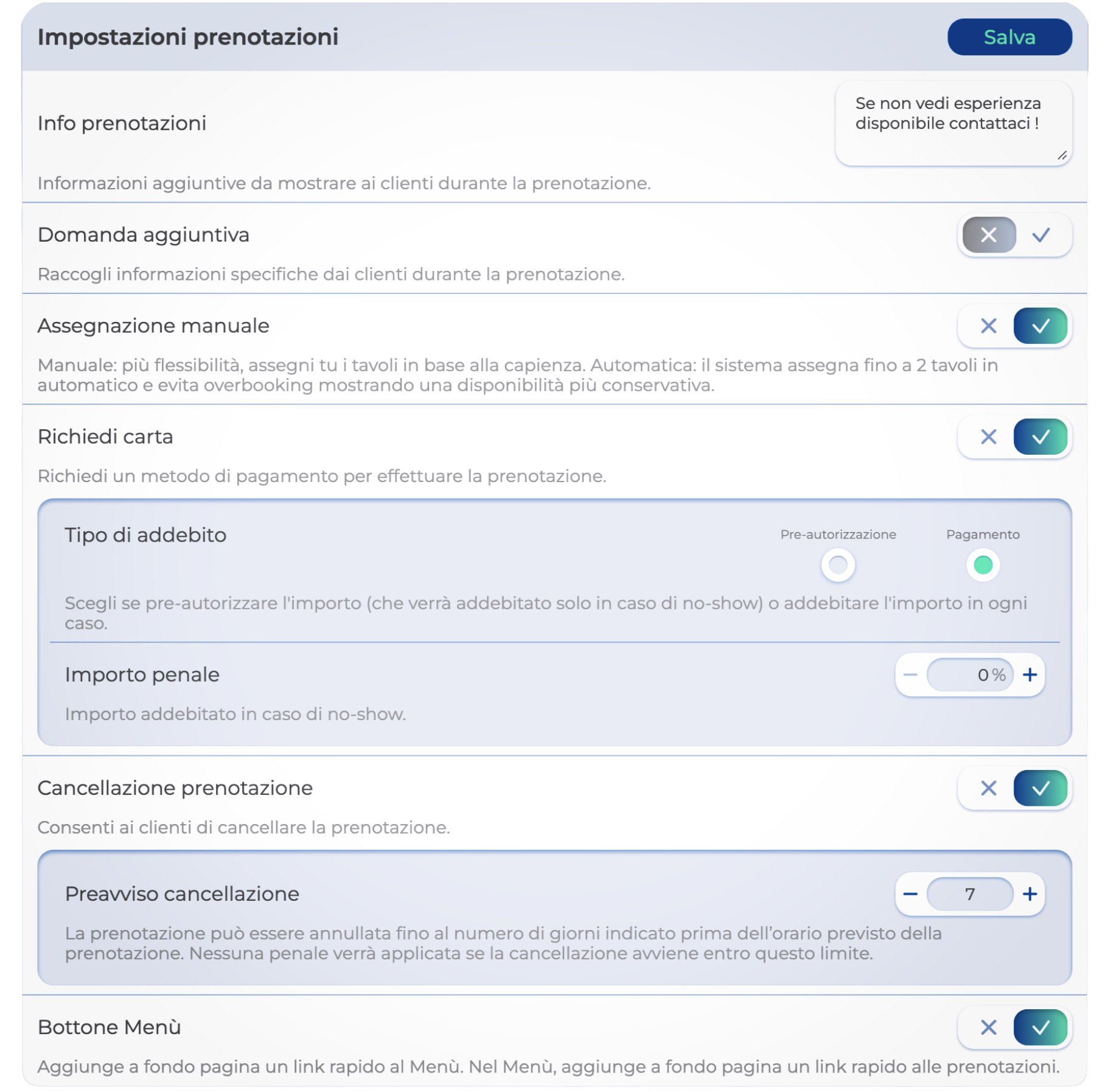 In caso di no-show, puoi applicare una penale calcolata sui prezzi impostati in ogni singola esperienza.Cancellazione prenotazione: se attiva, i clienti possono cancellare dal link di prenotazione in base al tempo pre-impostato nelle impostazioni