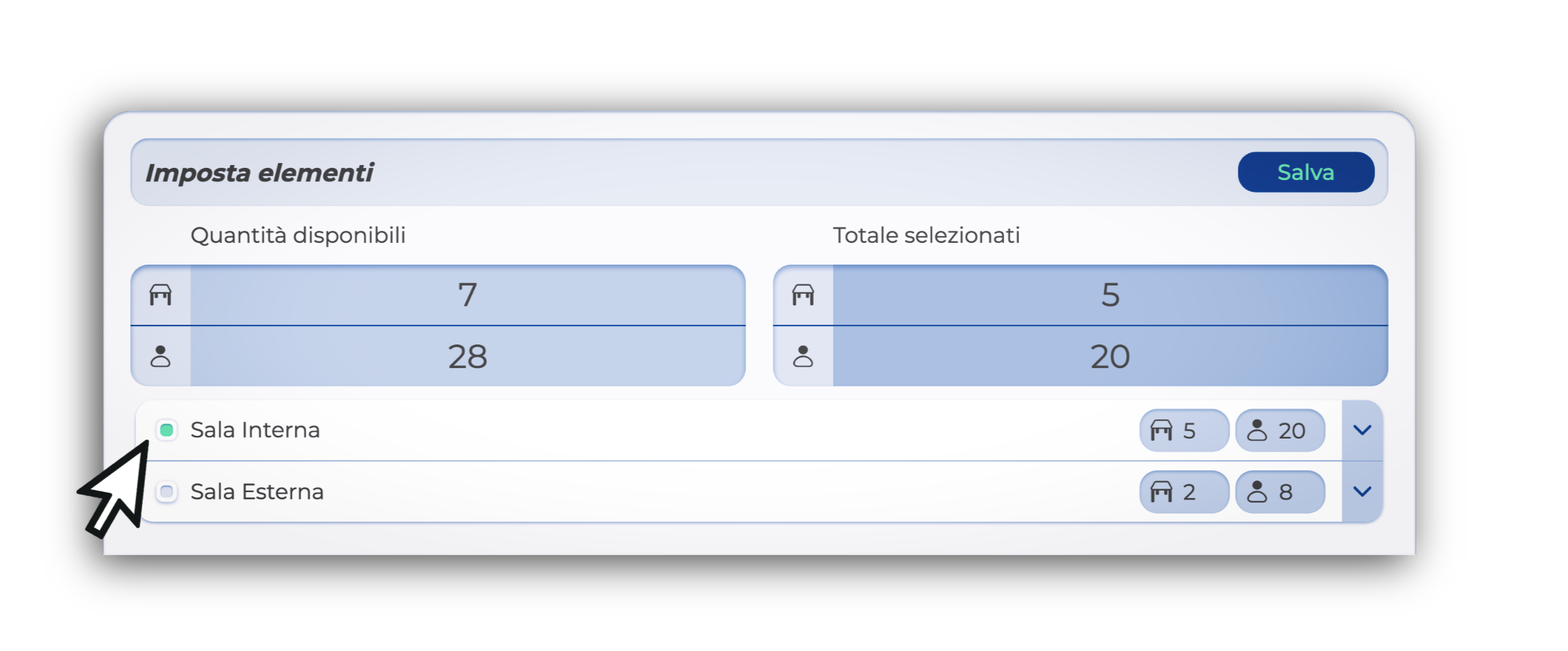 Elementi associati: seleziona gli elementi disponibili per le prenotazioni online, puoi controllare il totale dalla tabella sulla destra Tavoli selezionati.