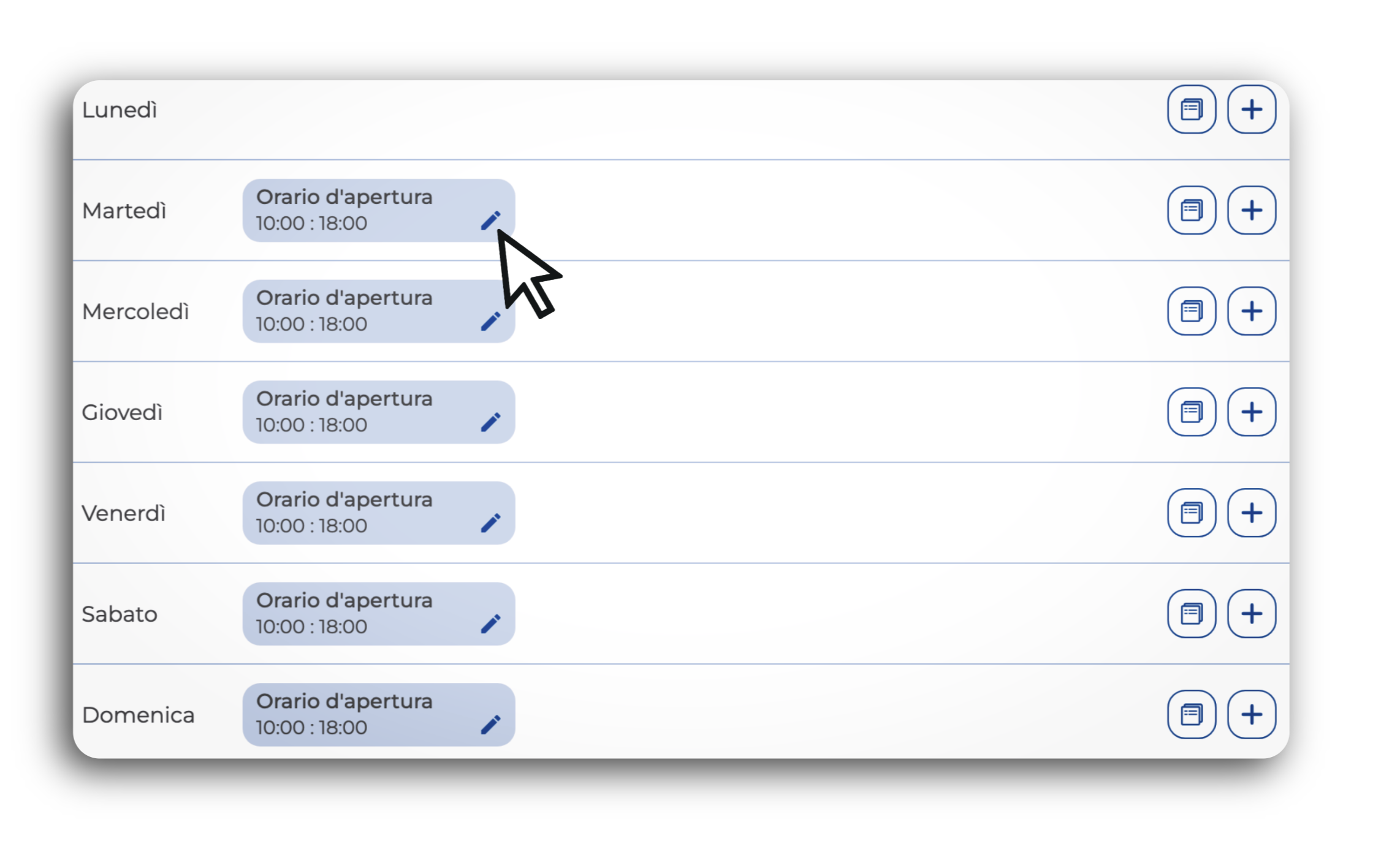 Per impostare giorni di chiusura ricorrenti, devi usare la sezione Imposta orario, escludendo il giorno desiderato, per creare un’eccezione permanente.