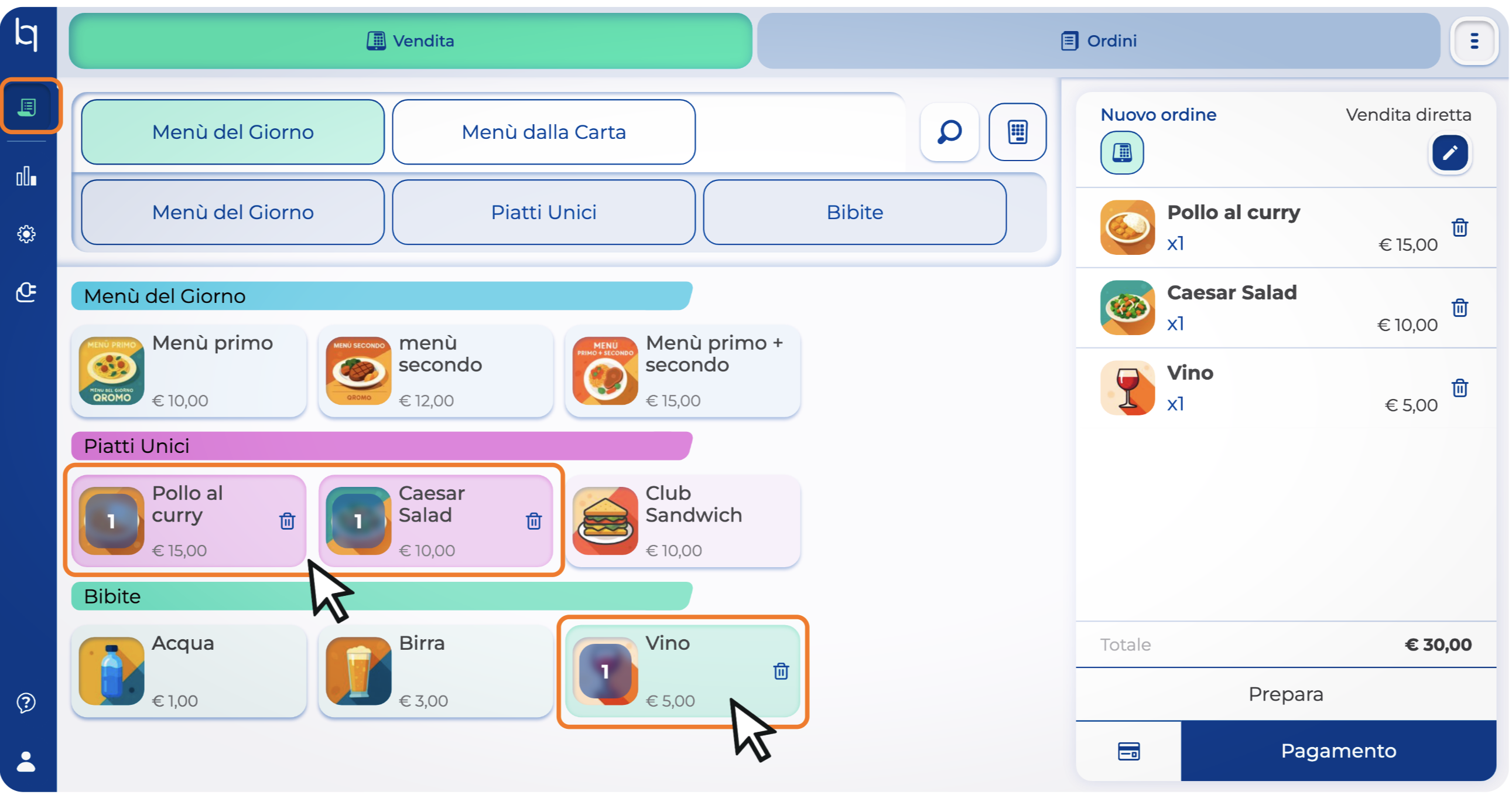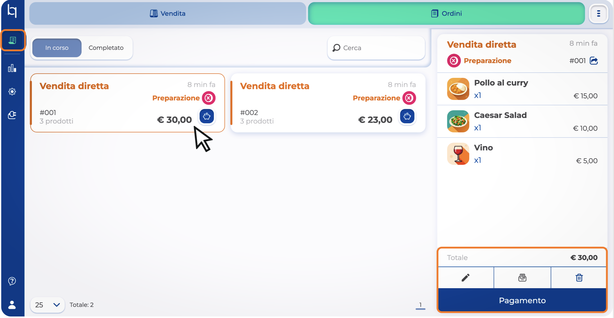 Paga un ordine dalla sezione Ordini | 1. Seleziona l’ordine in Ordini 2. Clicca Pagamento 3. Scegli il metodo di pagamento per chiudere definitivamente l'ordine |