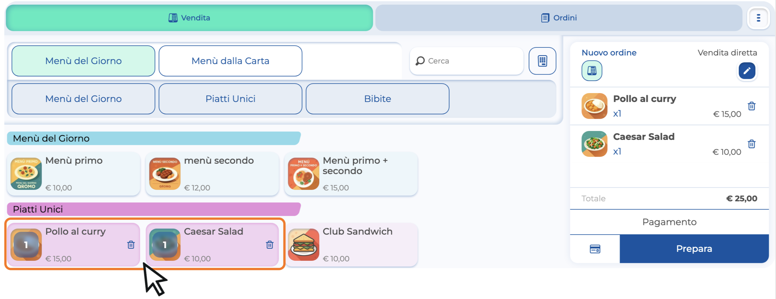 2. Seleziona i prodotti visibili a sinistra dello schermo; verrano caricati automaticamente nella scheda Riepilogo d'ordine.