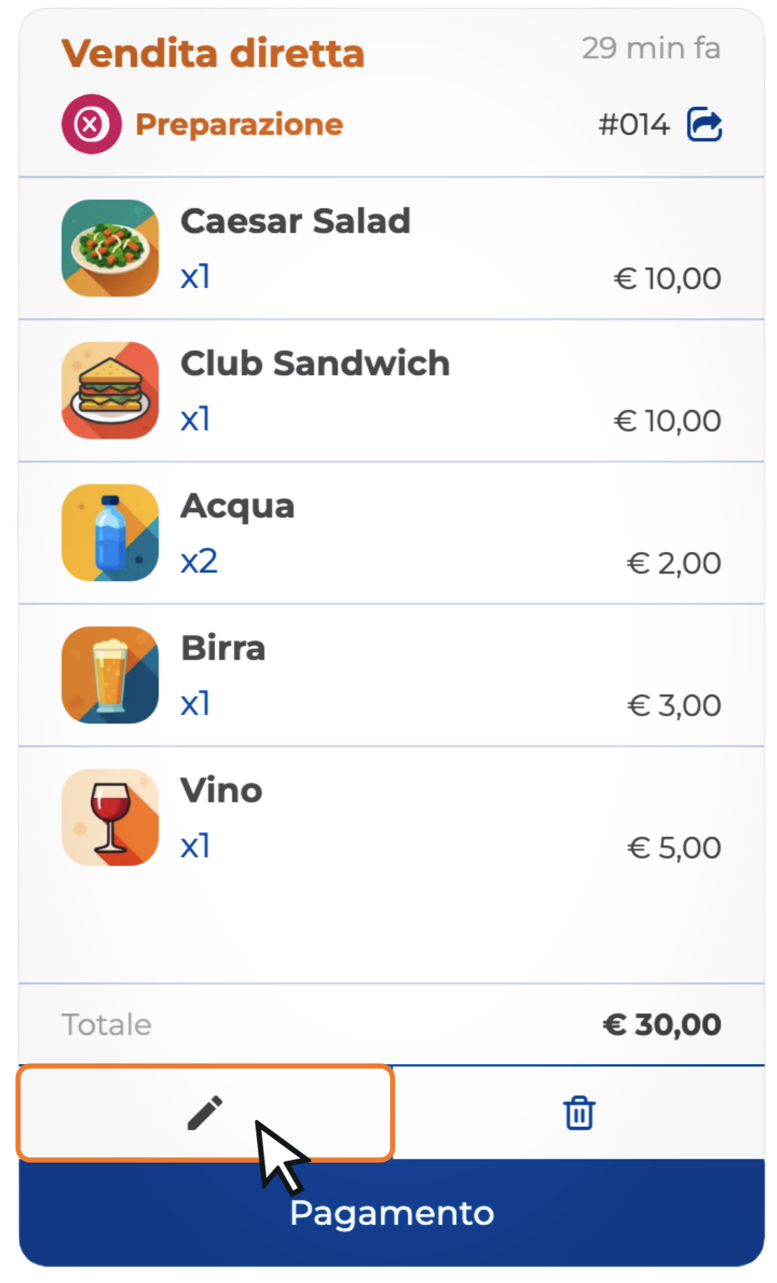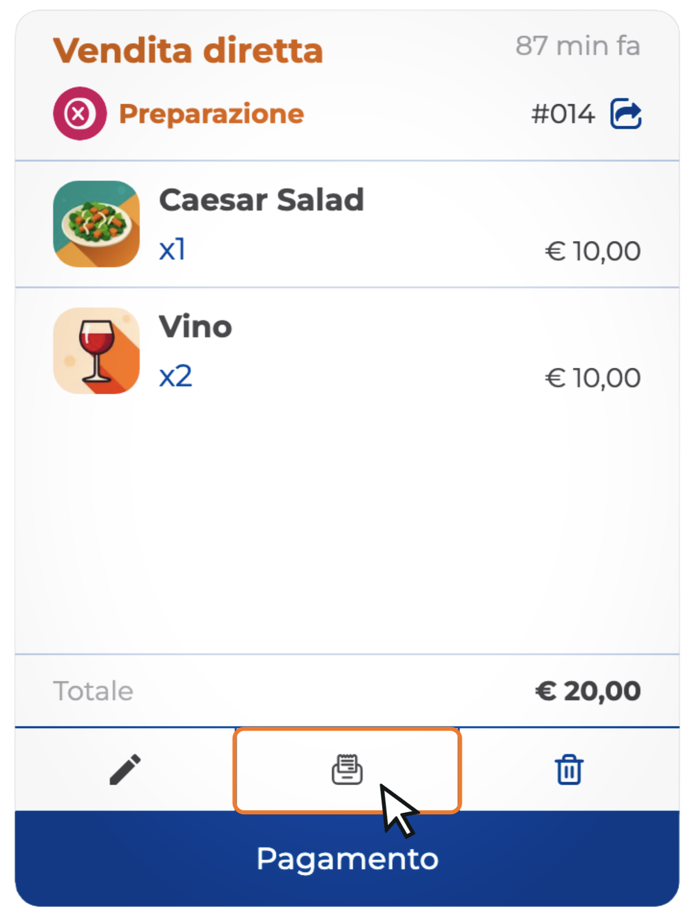 7. Per chiudere un ordine e spostarlo tra gli ordini completati, fai click su Pagamento per aprire la Maschera di Pagamento e procedere al saldo.