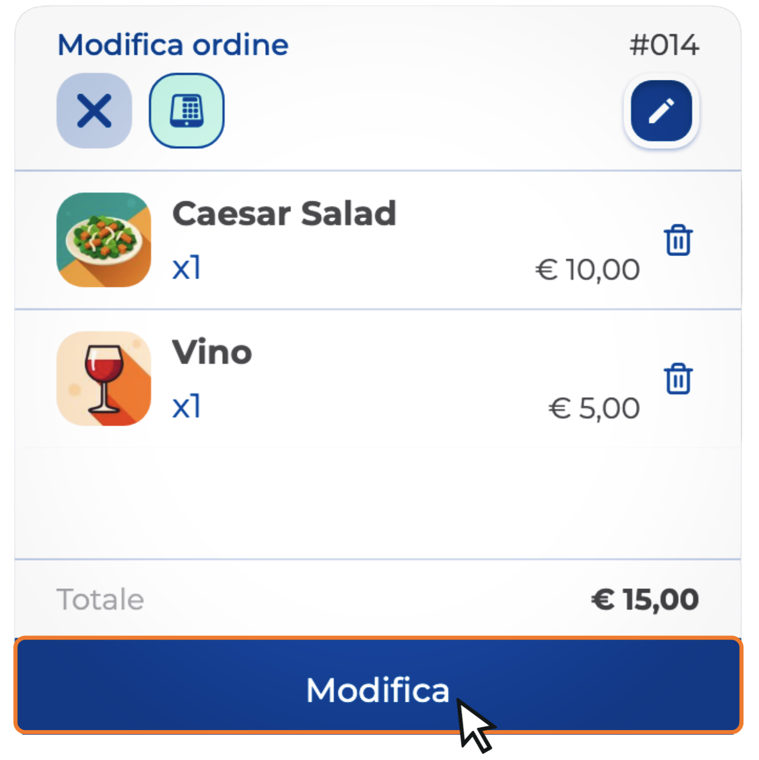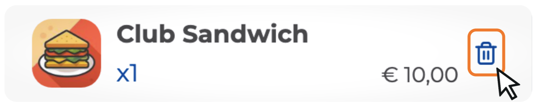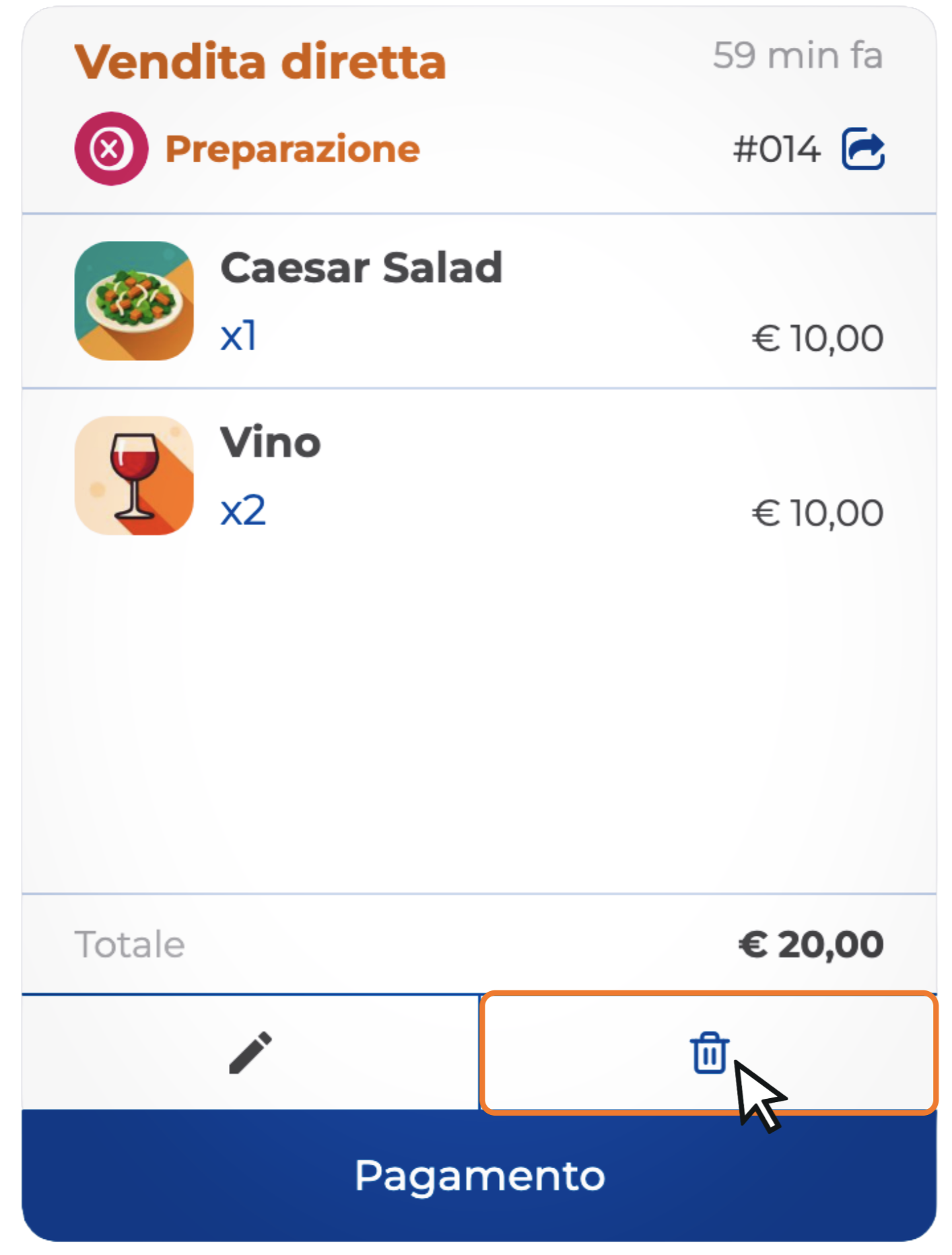 6. Per Annullare o Eliminare un ordine, selezionalo tra gli ordini in corso e clicca sull’icona del cestino in basso al riepilogo dell’ordine.