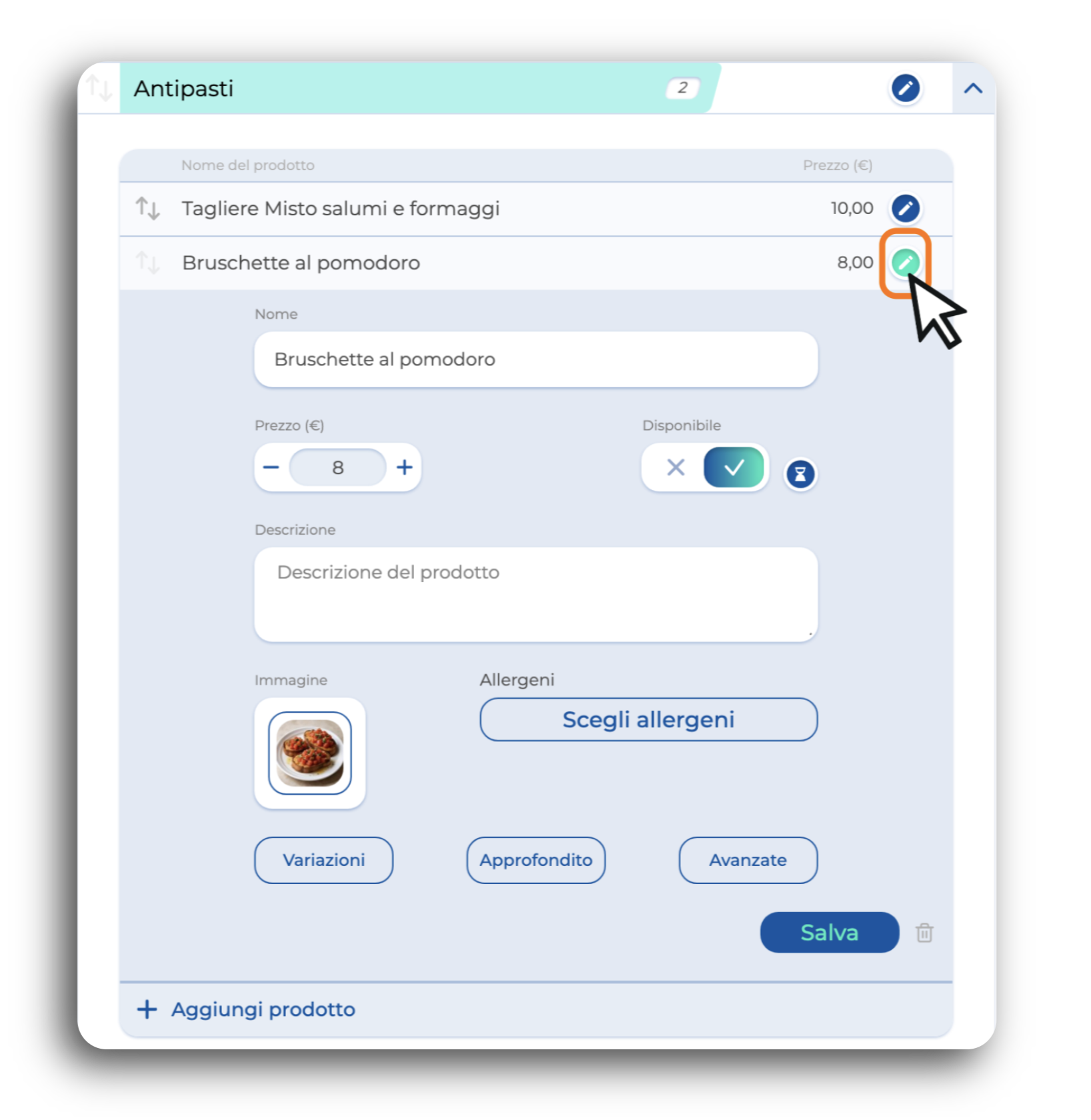 - Disponibile: se disattivato rende il prodotto non visibile sul menù online