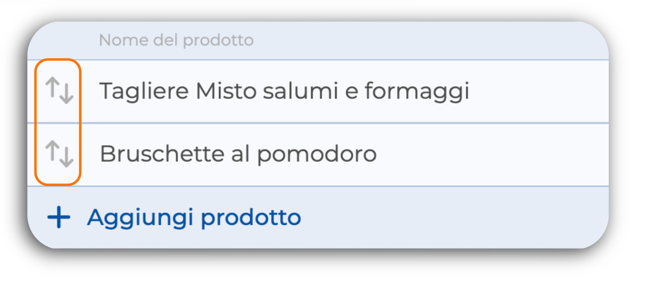 - Ordine Prodotti: sposta l'ordine dei prodotti tramite le frecce accanto al prodotto