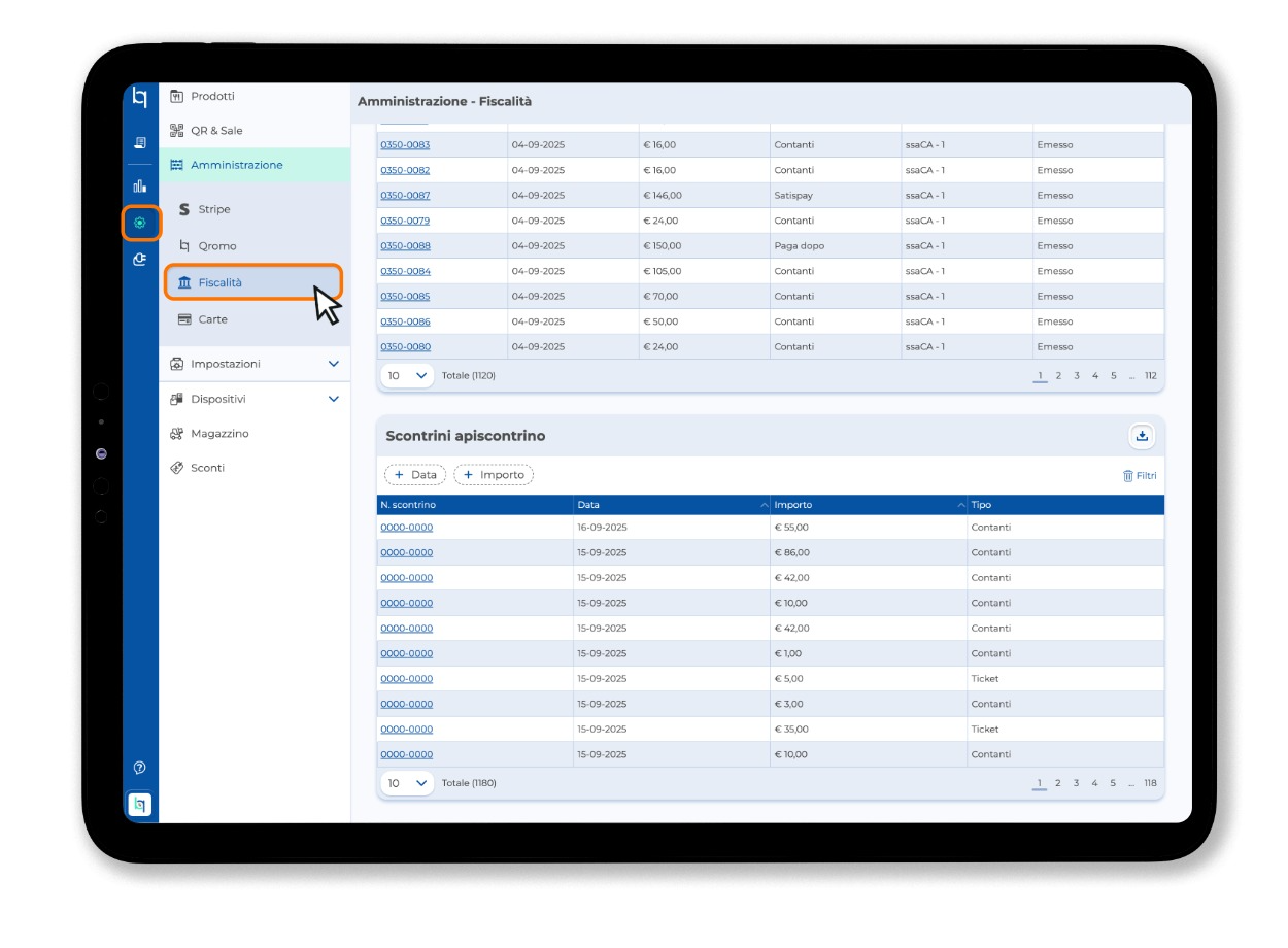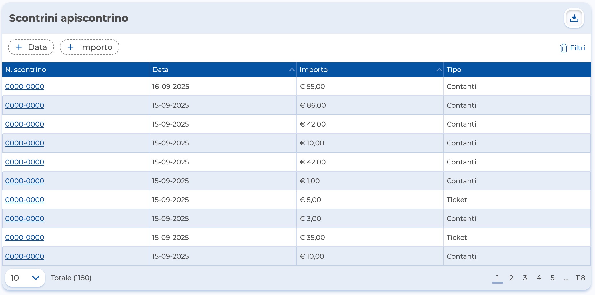 - N. Scontrino: identifica il numero univoco dello scontrino associato all’ordine emesso, cliccandoci sopra aprirai l'ordine di riferimento