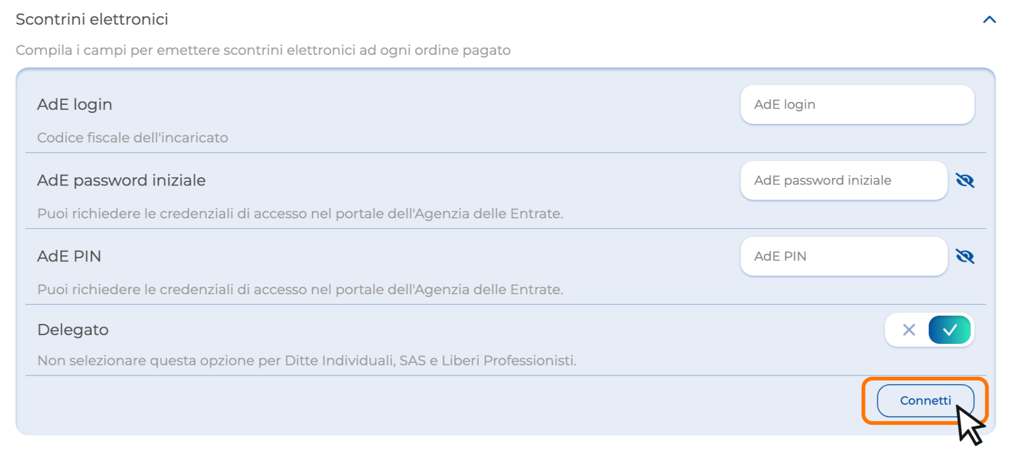 3. Apri la voce Scontrini Elettronici. Inserisci le credenziali e fai click su Connetti.