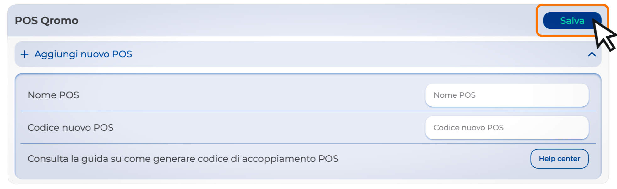 6. Fai click su + Aggiungi Nuovo POS, inserisci i dati, e ricordati sempre di Salvare: