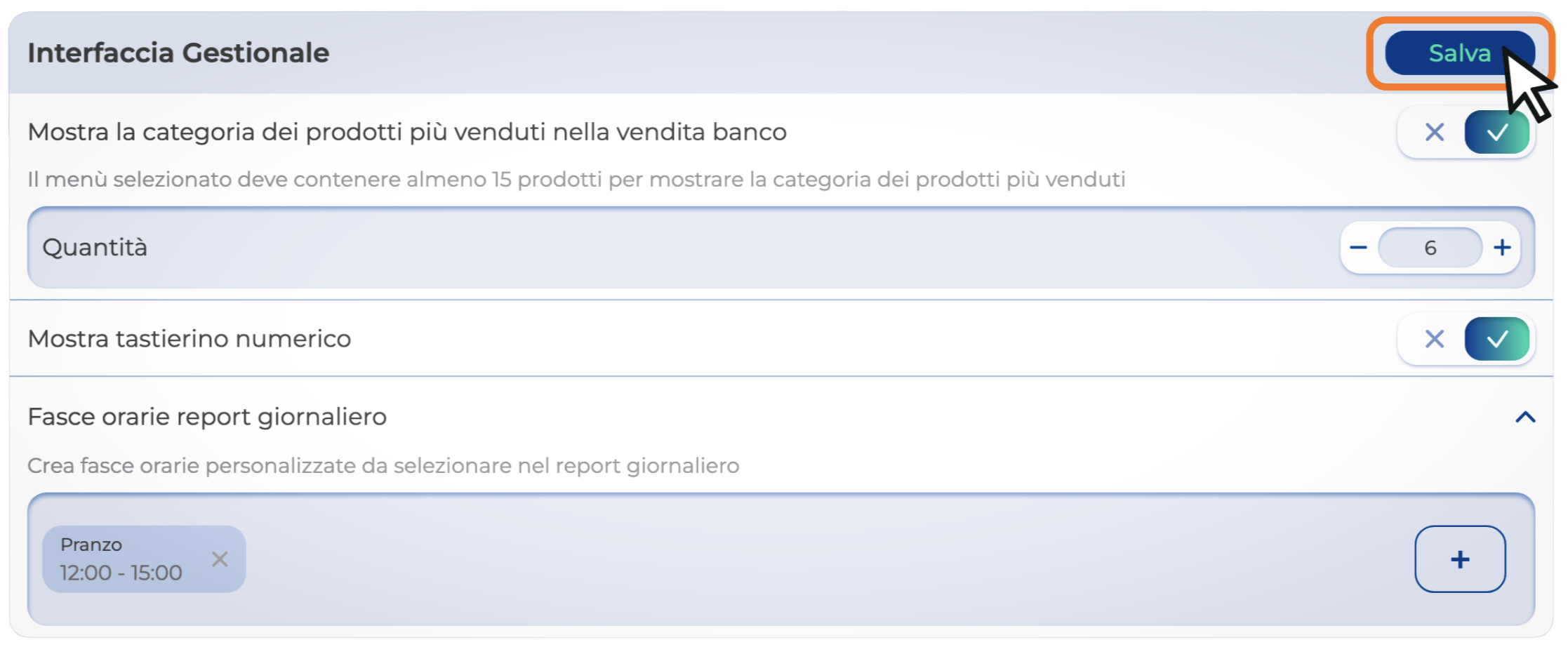 - Mostra la categoria dei prodotti più venduti nella vendita banco: mostra, in fase di ordine, i prodotti più venduti. Scegli anche la quantità di prodotti da mostrare