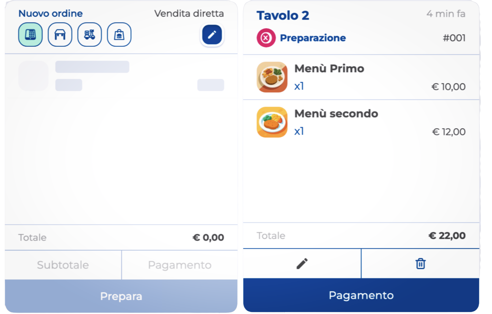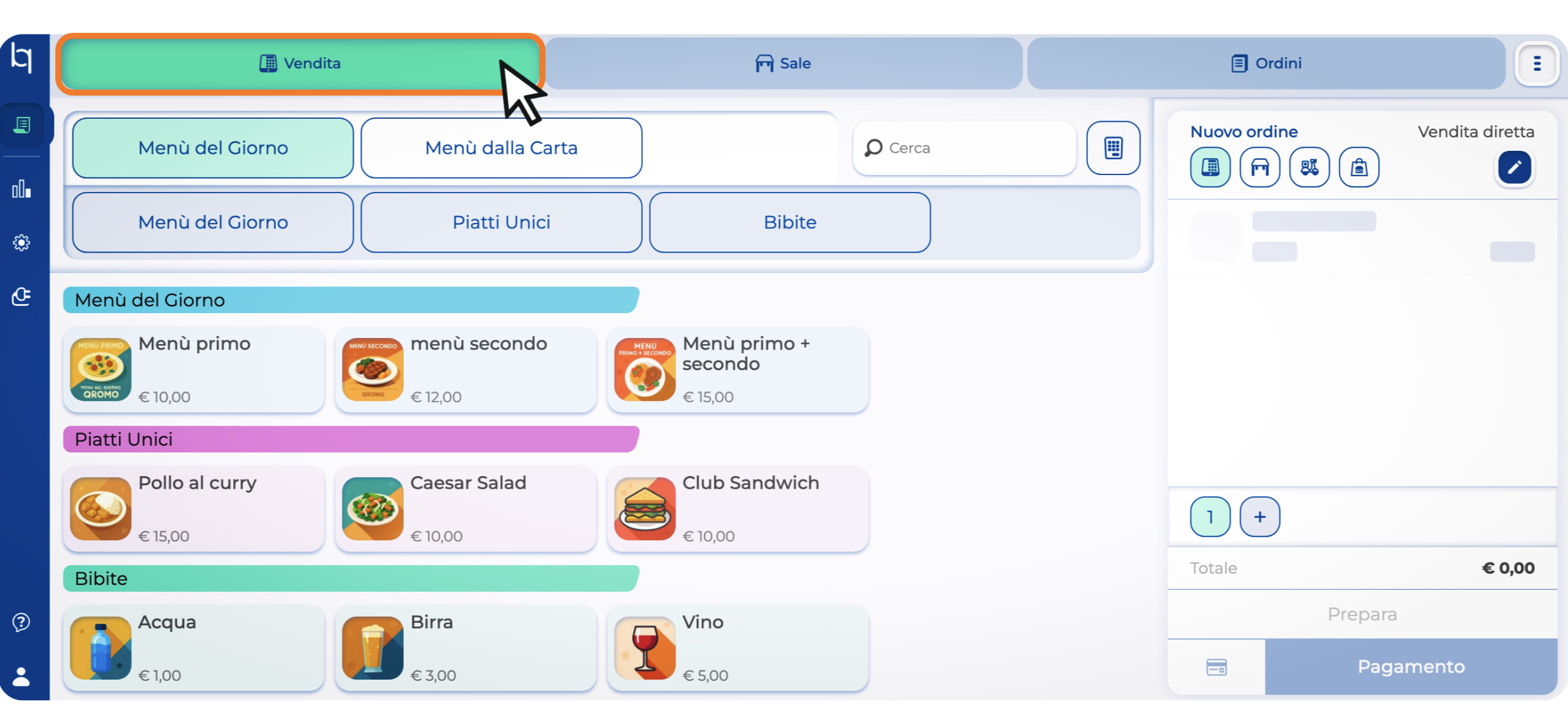 La sezione Vendita serve a gestire rapidamente le comande veloci, come quelle al bancone, dove ordine e pagamento vengono spesso registrati insieme senza tavolo.