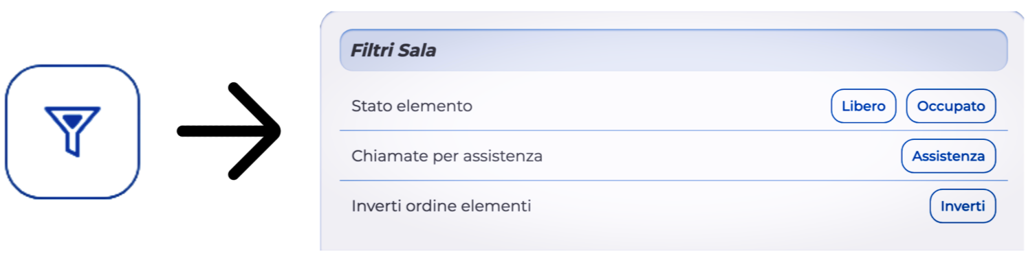 - Chiamate per assistenza: permette di vedere solo i tavoli che hanno richiesto assistenza. Va attivata nelle impostazioni della Sala.