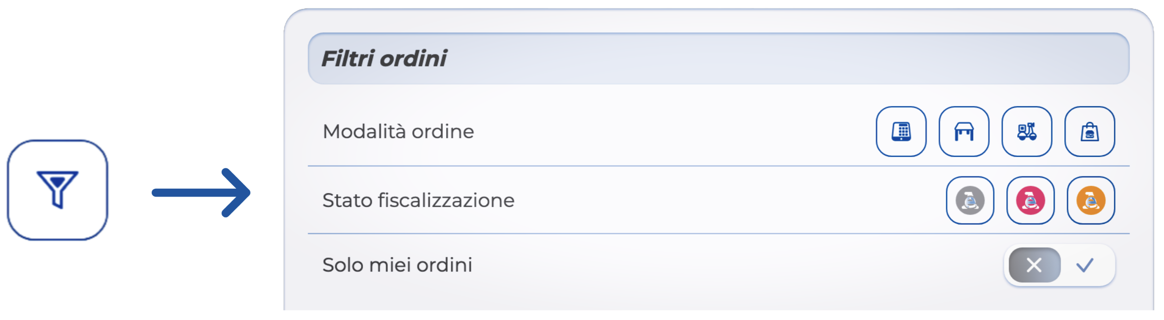 - Solo miei ordini: permette di escludere gli ordini online e quelli delle altre eventuali Postazioni e visualizzare solo quelli inseriti dalla Postazione che si sta utilizzando