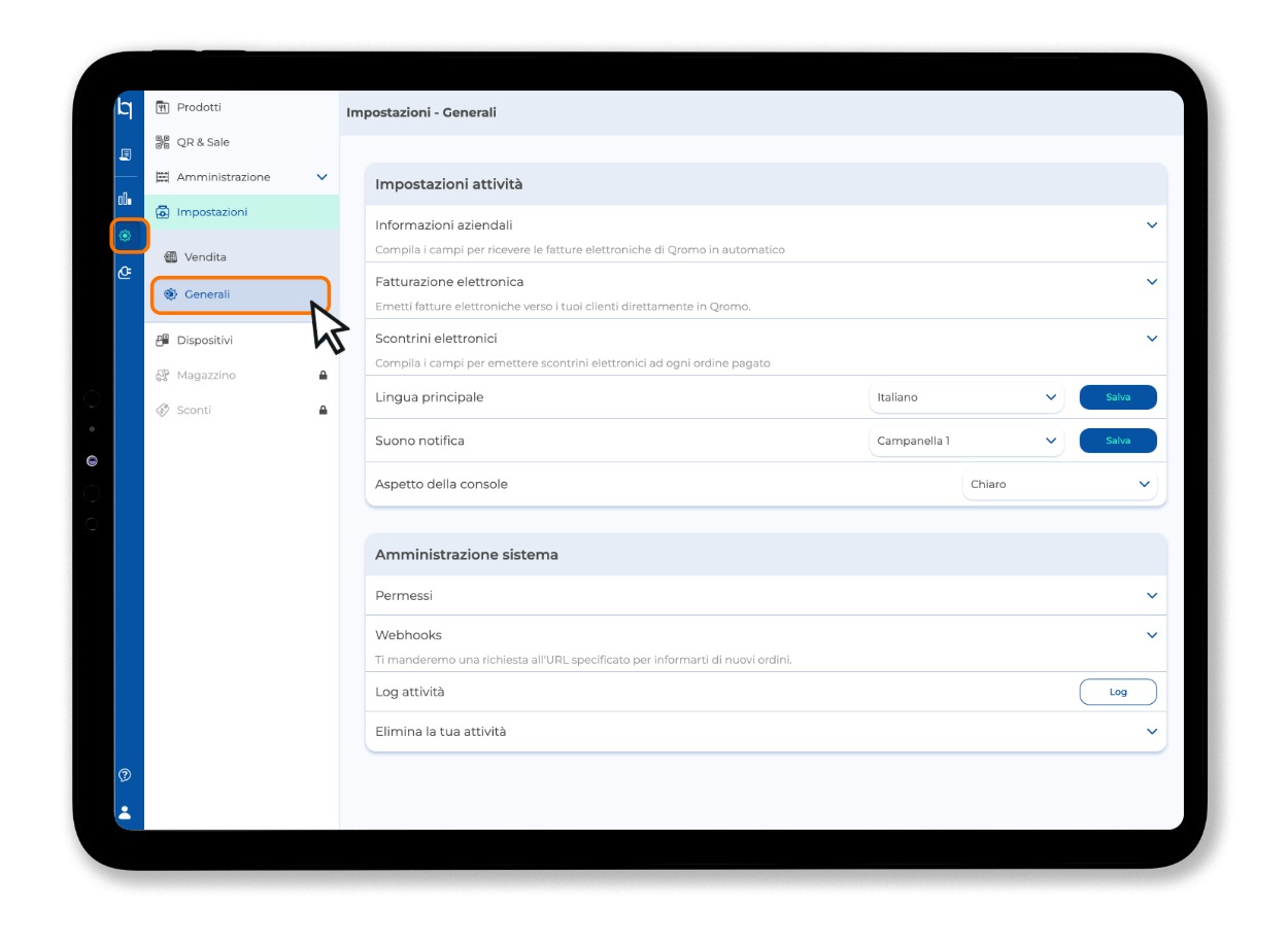 - Suono notifica: è possibile scegliere il suono della notifica quando si riceve un ordine, basta fare click sul pulsante "Notifica" e Salvare