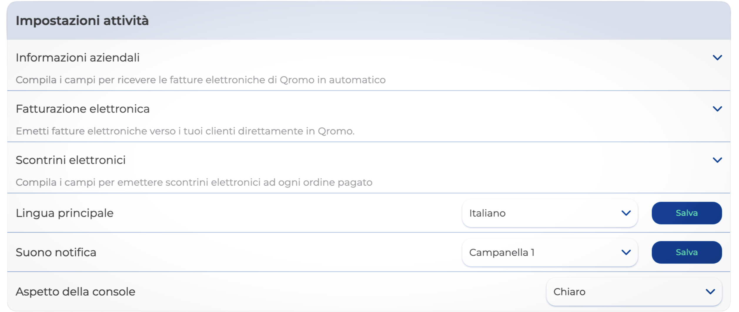 - Informazioni aziendali: È importante compilare correttamente i campi dedicati per ricevere automaticamente le fatture elettroniche da Qromo, ed eventualmente emetterle