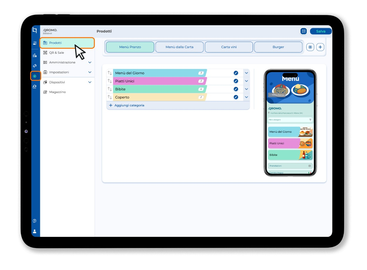 6. Ricordati sempre di salvare le modifiche: usa il Salva dei singoli prodotti o categorie e, una volta terminato tutto, il Salva in alto a destra.